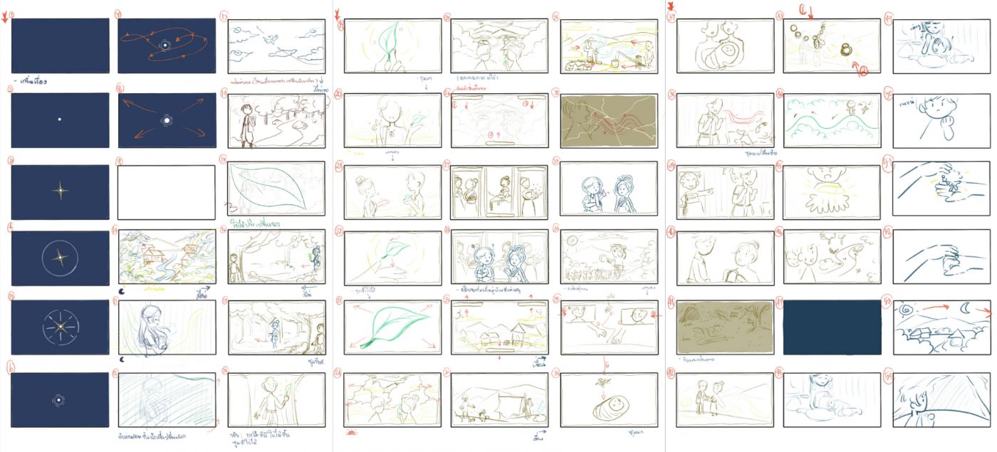 ส่วนในส่วนของ Storyboard แรกนั้นเรียกได้ว่ายังออกมาไม่ดีเท่าไหร่เพราะอยากทำแอนิเมชันโดยใช้เทคนิค Motion graphic ซึ่งไม่เคยลองทำมาก่อนจึงยังไม่มีภาพในหัวชัด ๆ ทำได้เพียงออกแบบคร่าว ๆ ก่อน