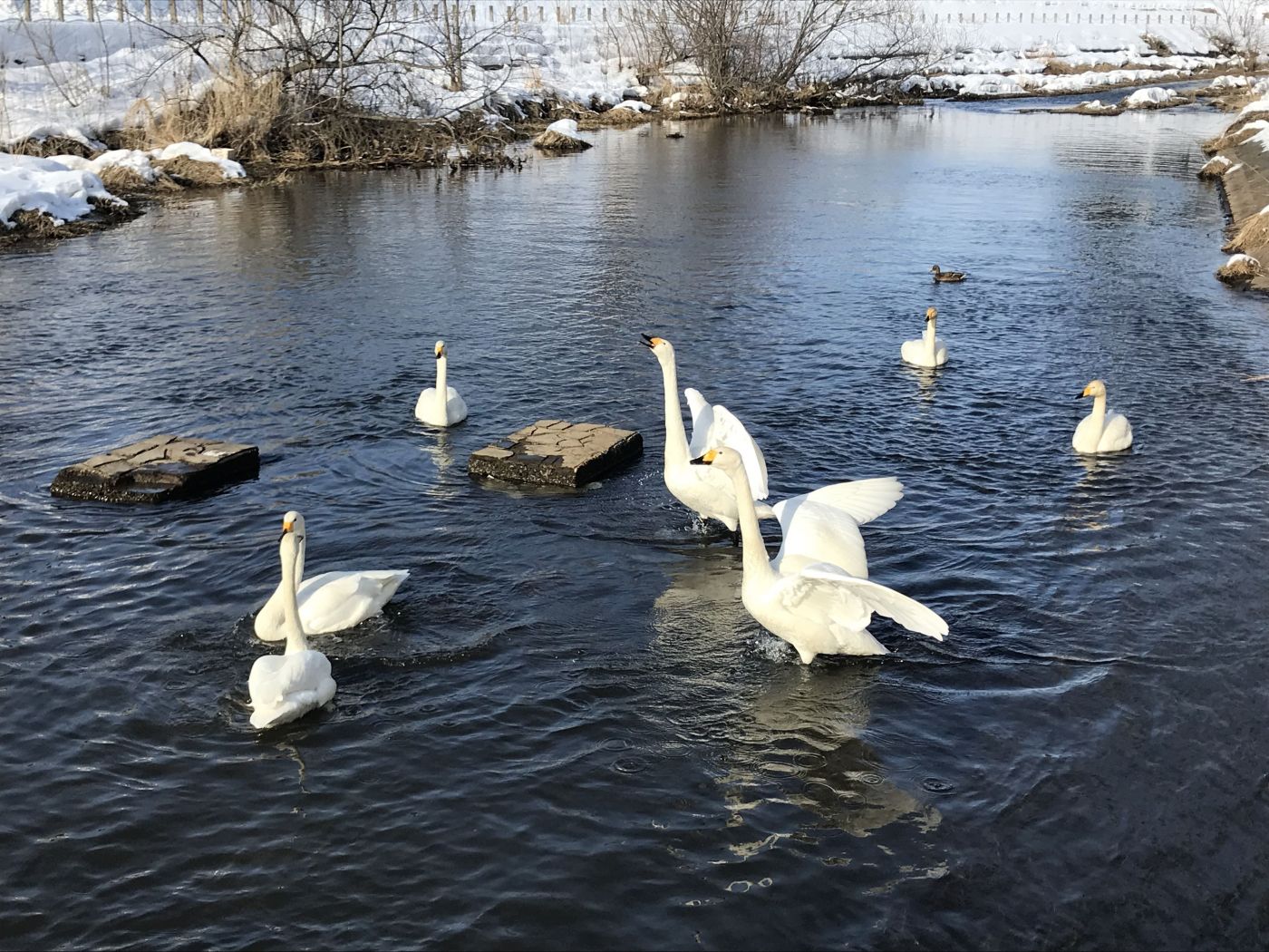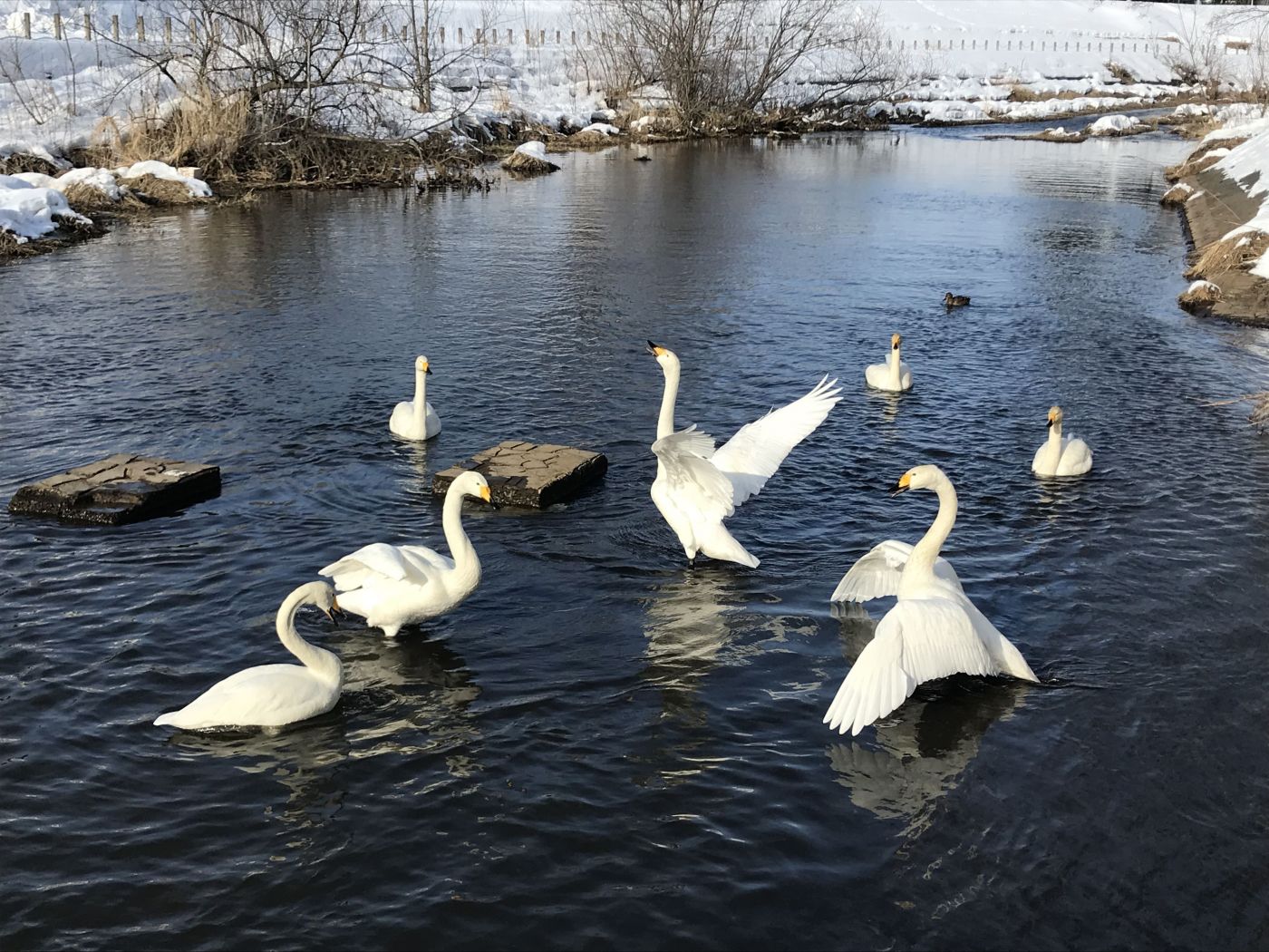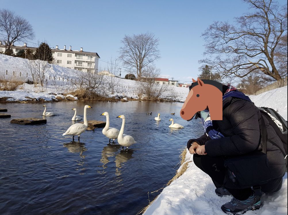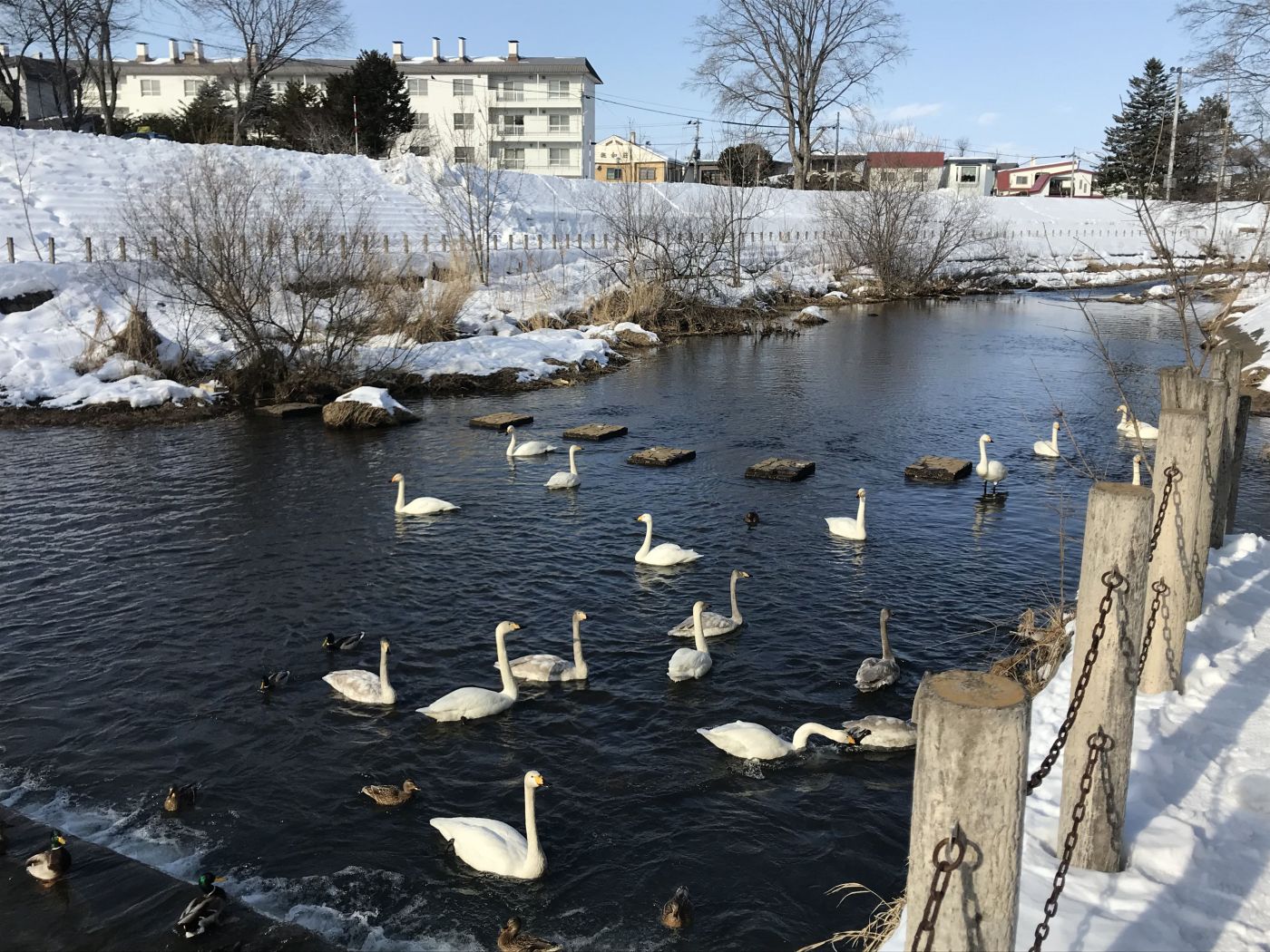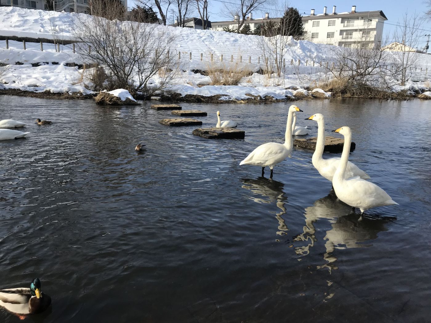 อีกอย่างที่เราตั้งใจจะมาดูมากๆ ตามที่หาข้อมูลมา คือ แม่น้ำข้างๆศาลเจ้า ที่เฉพาะในฤดูหนาวจะมีหงส์อพยพมาอยู่กัน บรรยากาศดีมาก คุ้มค่ากับการต้องค่อยๆไต่บันไดที่มีแต่หิมะลื่นๆลงไปริมตลิ่ง