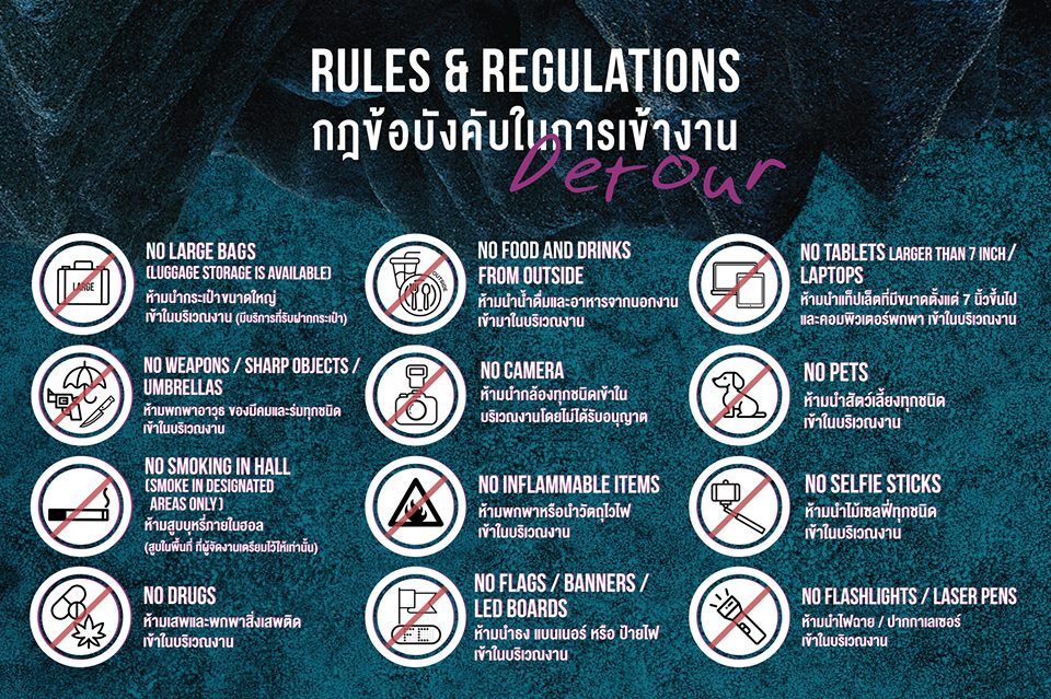 ถ้าผู้จัดจะตรวจกระเป๋า ห้ามเอาร่มพับเข้าแล้ว กล้องถ่ายรูปก็น่าจะเป็นอีกอย่างที่ห้ามจริงๆ จังๆ หน่อยนะ เห็นแล้วหงุดหงิดใจ เพราะเราอยากเอากล้องไปถ่ายรูปมากเลย กล้องมือถือมันห่วย ทางผู้จัดไม่ให้เอาเข้า เราก็ไม่เอาไป แล้วต้องมาเจอคนทำแบบนี้ก็แอบเซ็งเหมือนกันนะ