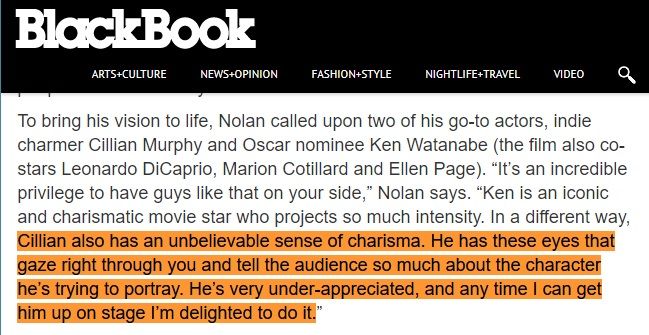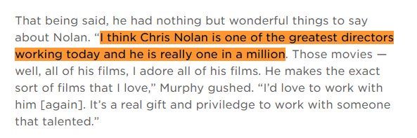 คริส โนแลนก็รู้สึกเช่นกันว่าคิลเลียน เมอร์ฟีเป็น "นักแสดงที่ดีที่สุด" ในเจเนอเรชั่นตัวเอง