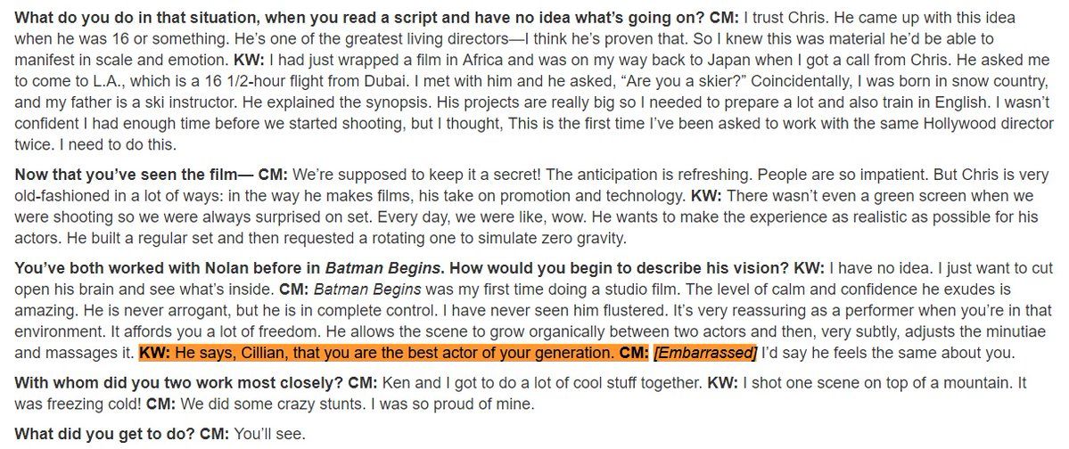 "ผมเชื่อใจคริส " ที่คิลเลียนย้ำเสมออีกอย่างคือ ความเช่ือใจที่เขามีต่อคริสในการทำหนัง ย้ำบ่อยมาก ๆ เช่นกัน อย่างตอนอ่านบท Inception แล้วใคร ๆ ก็ไม่เข้าใจทั้งนั้นแหละว่าเนื้อเรื่องมันอะไรเนี่ย แต่คิลเลียนก็เชื่อใจคริสและเล่นให้ และย้ำตลอดว่า คริสคือหนึ่งในผู้กำกับภาพยนตร์ที่เก่งที่สุดที่ยังมีชีวิตอยู่