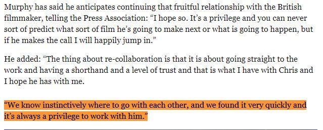 Note: ชอบความสัมพันธ์(เรื่องงาน)ของคริส โนแลนกับคิลเลียน เมอร์ฟีตรงนี้นะ ทั้งคู่ดูพอใจกับการทำงานร่วมกันมากๆ แบบเป็นคู่คิดกันได้ ไว้ใจกัน และทำงานเข้าขากันโดยสัญชาตญาณ