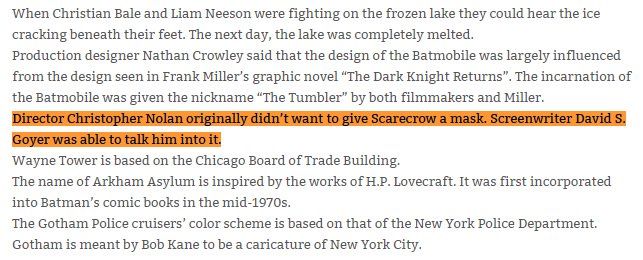 แรกเริ่มคริส โนแลนไม่ได้อยากให้ Scarecrow ต้องใส่หน้ากาก แต่ผู้เขียนบทหนังไตรภาคแบทแมน เดวิด เอส. โกเยอร์ โน้มน้าวให้โนแลนยอมได้สำเร็จโจนาธาน เครนกับหน้ากากสแกร์โครว์ ใน Batman Begins