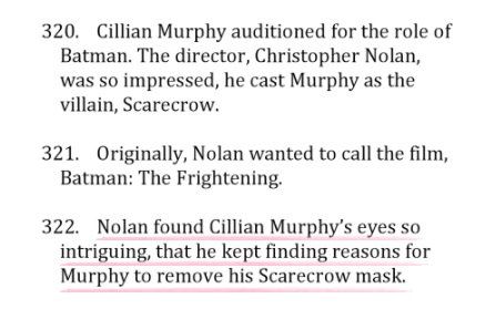 โนแลนรู้สึกว่าดวงตาของคิลเลียนมีเสน่ห์ดึงดูดใจมาก จนเขาคอยแต่จะหาข้ออ้างให้คิลเลียนต้องถอดหน้ากากสแกร์โครว์ออกอยู่ตลอดเวลาบางทีคริส โนแลนอาจจะแค่อยากเห็นดวงตาคู่นั้นในหนังของเขาอีกครั้ง