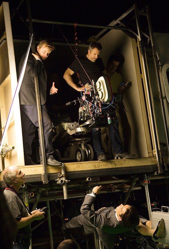 คริสโตเฟอร์ โนแลนกำลังกำกับคิลเลียน เมอร์ฟีและลีโอนาร์โด ดิคาปริโอในกองถ่าย Inception (2010)