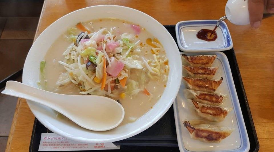 เป็นราเมงที่รวมสารพัดผัก สารพัดเนื้อ สารพัดอาหารทะเล แถมน้ำซุปก็อร่อยไม่เคยผิดหวั่ง เกี๊ยวซ่า6ชิ้นมาเสิร์ฟพร้อมกับรางเมง รวมๆแล้วน้ำหนัก(ไม่รวมน้ำซุป)ประมาณ800กว่ากรัม(เขียนระบุไว้ในเมนู) คุณมัตสึโมโต้เล่าให้ฟังว่าเมนูนี้ดังที่สุดก็ที่นางาซากิ(長崎) ส่วนเรื่องราคา...ถ้ามากินกับคุณมัตสึโมโต้ก็อดจ่ายเองตามเคยเลยไม่รู้ราคาเลย ในใบเมนูก็ไม่เอะใจดู ยังไงก็ขอบคุณนะครับมัตสึโมโต้ซัง^^