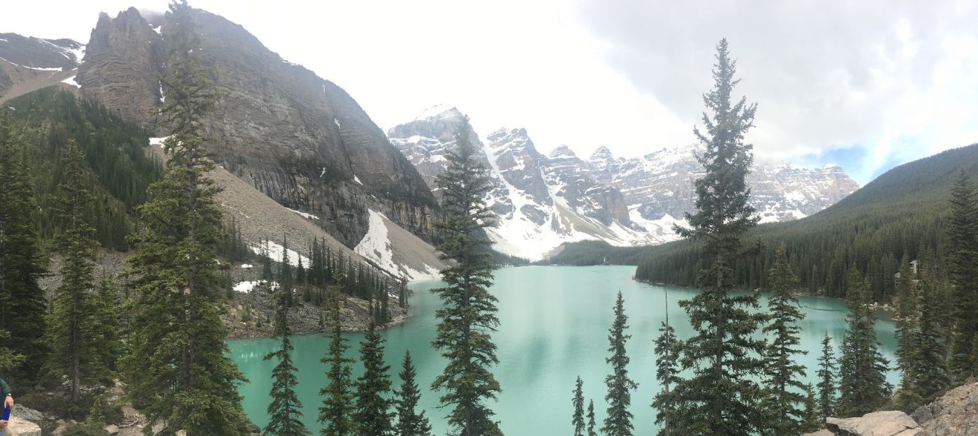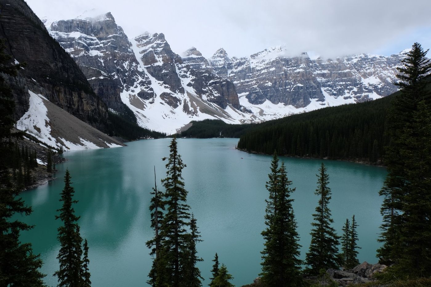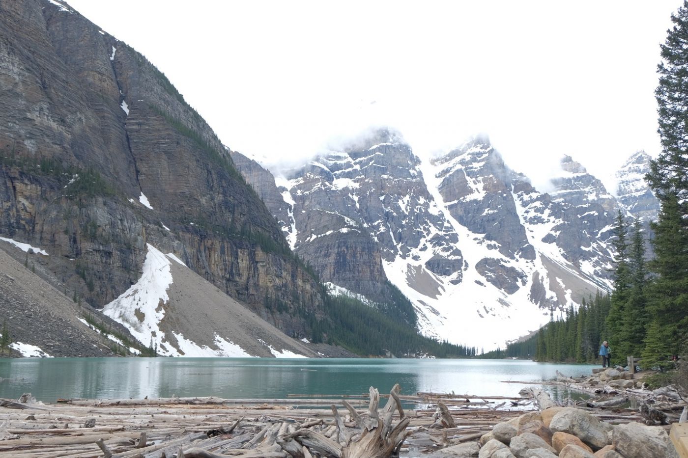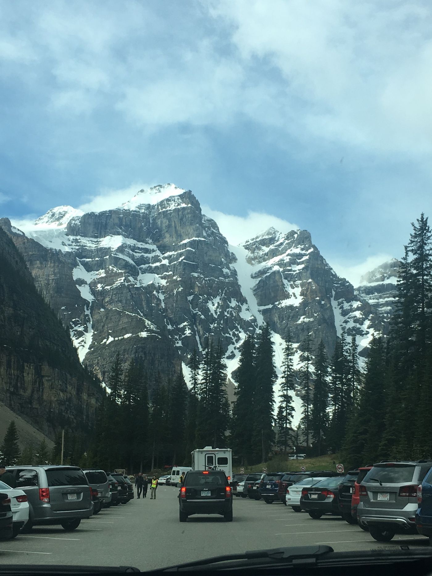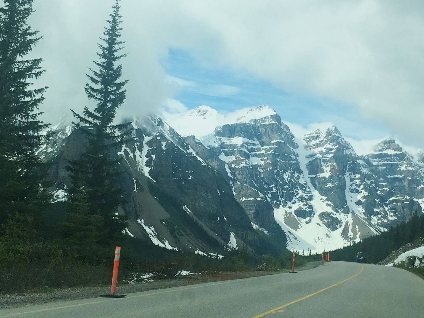 ในแบมฟ์อากาศดี แต่พอขับออกมาสักพักก็รู้สึกว่าไม่ดีล่ะ มันครึ้มๆ เมฆเยอะ เหมือนฝนจะตก แล้วตอนแยกเข้าโมเรนเลคก็ยิ่งรู้สึกครึ้มมาก และฝนก็ตกลงมานิดนึงแล้วก็หยุด ถึงแม้อากาศจะหม่นๆ แต่ก็ดีแค่ไหนแล้วที่ฝนไม่ตกที่โมเรนเลค นี่พยายามคิดบวกสุดๆ ถึงแม้จะอากาศไม่ดีโมเรนเลคก็ยังสวยมาก ดีใจที่ได้มาเห็นอะไรแบบนี้ ที่สำคัญโมเรนเลคเปิดให้เข้าแค่ช่วงมิถุนา-ตุลา
