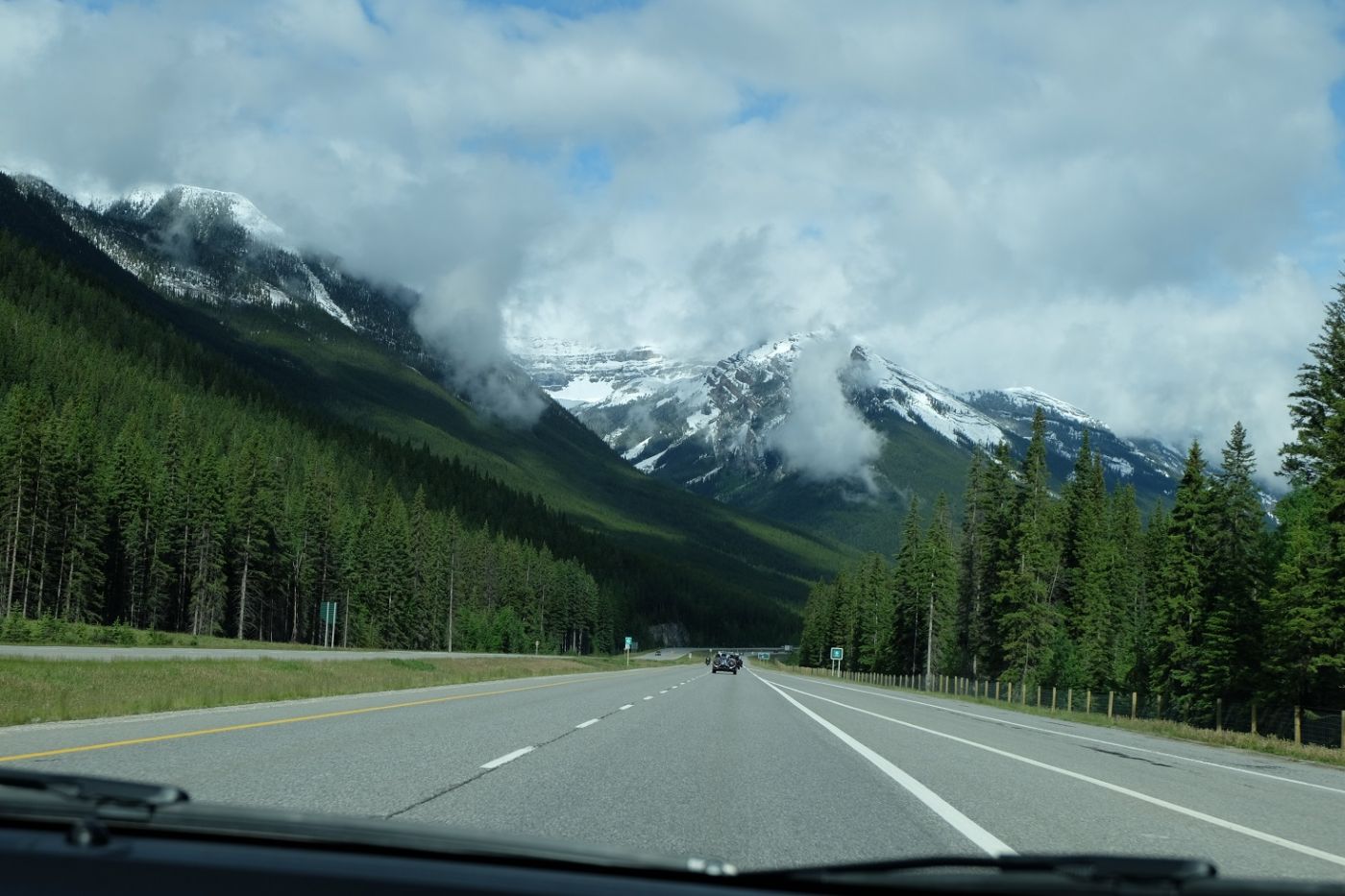 ก่อนจะออกจากแบมฟ์เรายังจอดรถแวะซื้อน้ำ แวะถ่ายรูปวิวในเมืองกับป้ายแบมฟ์ส่งท้ายก่อนบอกลาเมืองนี้ ไปแบบเรื่อยๆ ไม่รีบ จากแบมฟ์ถึงโมเรนเลคใช้เวลาประมาณ70นาที วิ่งเส้นTrans-Canada Hwy แล้วแยกออกทางเดียวกับLake Louis ขับไปเรื่อยๆ ก็จะเจอทางแยกไปMoraine lake พอเลี้ยวซ้ายไปปุ๊บถนนจะเล็กลงทันที เหลือแค่ฝั่งละเลนและแซงไม่ได้ เราไม่ได้จะแซงคันอื่นนะ แต่เวลาคันอื่นขับตามหลังมาแล้วโคตรกดดันเลย เหมือนคันหลังจะบอกว่า"ขับไปเร็วๆ สิ"