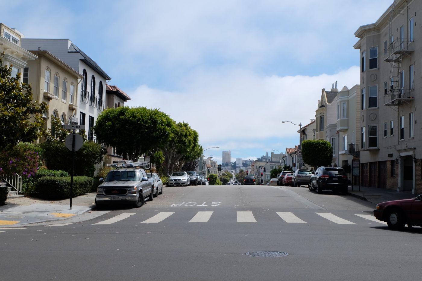 Lombard streetนี่สามารถนั่งรถมาลงได้หลายทางอยู่เหมือนกัน ลงรถแล้วก็ต้องเดินต่อ ก่อนไปเราเลยหาเส้นทางที่เดินขึ้นเขาน้อยที่สุดเตรียมพร้อมไว้ นั่นคือนั่งรถเมล์จากPalace of Fine Artsมาลงแถวๆ ร้านสเวนเซ่น (เลยร้านไปหนึ่งบล็อค) แล้วก็เดินต่อไปยังลอมบาร์ด