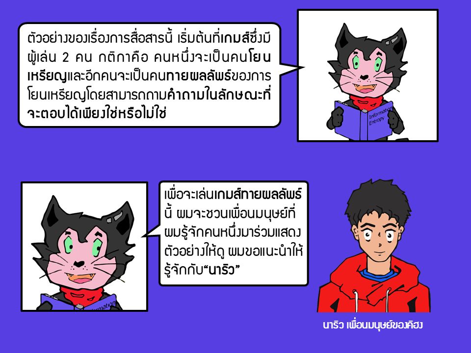 เกมส์ทายผลลัพธ์ที่คิฮงกำลังชวนนาริวมาเล่นนี้จะเกี่ยวพันกับปัญหาการสื่อสารที่แชนนอนพูดถึงได้อย่างไร ในตอนหน้าเราจะมาดูกันว่าด้วยพลังของ "อินฟอร์เมชั่นเอนโทรปี" นาริวใช้มันจะเอาชนะเกมส์ที่คิฮงชวนมาเล่นนี้ได้อย่างไร สำหรับตอนนี้ผมต้องขอจบเนื้อหาในส่วนของการ introduction ของทฤษฎีสารสนเทศไว้เพียงเท่านี้