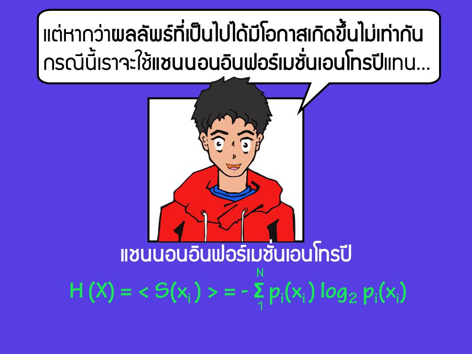 ในตอนที่แล้วเรารู้เเล้วว่า "อินฟอร์เมชั่นเอนโทรปี" เกี่ยวข้องกับความรู้ที่เรามีต่อระบบสักอย่างที่เราสนใจ หากเรารู้เกี่ยวกับระบบมาก เอนโทรปีก็จะมีค่าต่ำลง แต่หากเราไม่รู้อะไรเกี่ยวกับระบบเลย เอนโทรปีก็จะมีค่าสูงขึ้นจนถึงที่สุดที่จะเป็นไปได้ เมื่อเราได้รับผลลัพธ์ที่เกิดขึ้นจะกล่าวได้ว่า เรากำลังได้รับข้อมูลบางอย่างอยู่นั่นเอง
