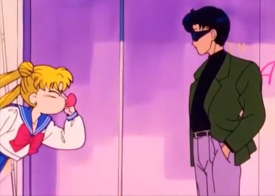 เมื่อมาถึงโรงเรียนอุซางิได้รับผลคะแนนสอบที่ไม่น่าพอใจนักเพราะเธอได้แค่ 30 คะแนนจากคะแนนเต็ม 100 คะแนน นารุจังที่เป็นเพื่อนสนิทจึงเข้ามาปลอบใจและเล่าเรื่องเซเลอร์วีให้ฟังว่า เป็นฮีโร่หญิงที่กำลังโด่งดังเพราะจับคนร้ายที่มาขโมยเพชรได้ และหลังจากนั้นก็ชักชวนอุซางิไปดูเพชรที่ร้านของเธอหลังเลิกเรียน แม้ว่าอุซางิจะอยากได้เพชรมากและนารุจังแนะนำให้เธอลองขอคุณพ่อให้ซื้อเพชรให้ แต่อุซางิก็ไม่กล้าทำแบบนั้นเพราะว่าผลคะแนนสอบไม่ค่อยดีเท่าไหร่ จึงตั้งใจว่าจะกลับไปขยันเรียนให้ดีขึ้น และที่หน้าร้านเพชรนี้เองที่เธอได้เจอมาโมจังเป็นครั้งแรก แต่สถานการณ์นั้นไม่ค่อยน่าประทับใจเท่าไหร่