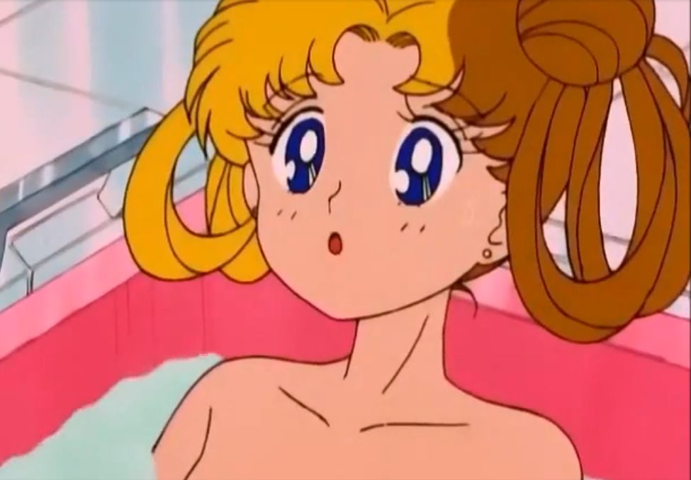 อุซางิม้วนผมขึ้นไปขณะแช่น้ำเพื่อกันผมเปียก