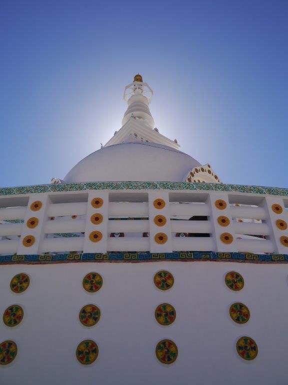 สถานที่แรกที่เราเข้าเยี่ยมชมคือเจดีย์ชานติ (Shanti stupa) ซึ่งสร้างโดยลามะชาวญี่ปุ่นที่ศรัทธาในพระพุทธศาสนาเมื่อปี1980 ฟังว่าองค์ดาไลลามะทำพิธีวางฐานรากที่นี่ด้วยพระองค์เอง ตัวเจดีย์สีขาวตั้งอยู่กลางแจ้ง เพื่อเป็นสัญลักษณ์ของสันติภาพระหว่างอินเดียกับปากีสถาน.