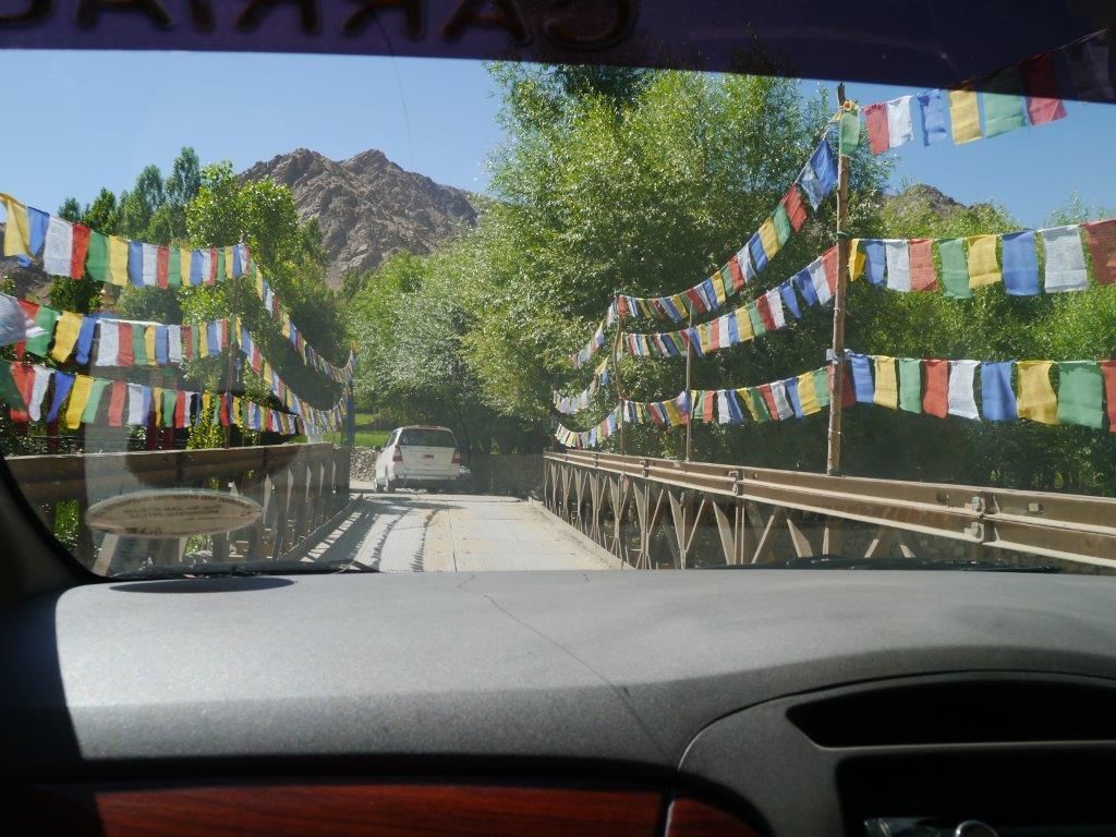 ขบวนรถของพวกเราเคลื่อนตัวออกจากโรงแรม ผ่านสะพานซึ่งราวสะพานพันไว้ด้วยธงมนตรามากมาย ธงมนตราเป็นเหมือนธงราวที่ผูกเอาธงรูปสี่เหลี่ยมผืนผ้า 5 สีเรียงจากซ้ายไปขวาเริ่มจาก เหลือง แดง เขียว ขาวและน้ำเงิน เป็นตัวแทนพระพุทธเจ้า 5 องค์ตามพระพุทธศาสนานิกายมหายาน ในขณะเดียวกันเป็นตัวแทนธาตุทั้ง 5 เริ่มจากดิน ไฟ น้ำอากาศและลม ตามด้วยจักรวาล ไม่มีใครทราบว่าธงมนตราเป็นอิทธิของศาสนาใดแต่เชื่อกันว่า จะนำสิ่งดีๆมาสู่บริเวณข้างเคียง.