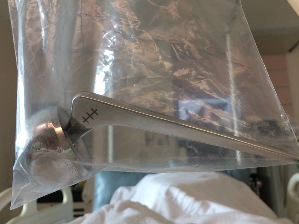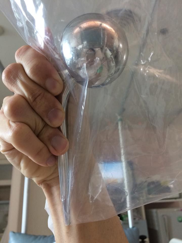 อันนี้คือข้อสะโพกเทียมแท่งเหล็กอันเก่าที่เคยใส่ไว้เมื่อ 10 ปีก่อน เอามาให้ดู หมอบอกเอาไว้เป็นที่ระลึก (ระทึกมากกว่ามั้ง แต่พอจับดูแล้วก็หนักใช่เล่นเลยนะ) ตอนนี้ก็มีเหล็กอันใหม่อยู่ในขาละ ยาวกว่าเดิมแข็งกว่าเดิม อึดกว่าเดิม