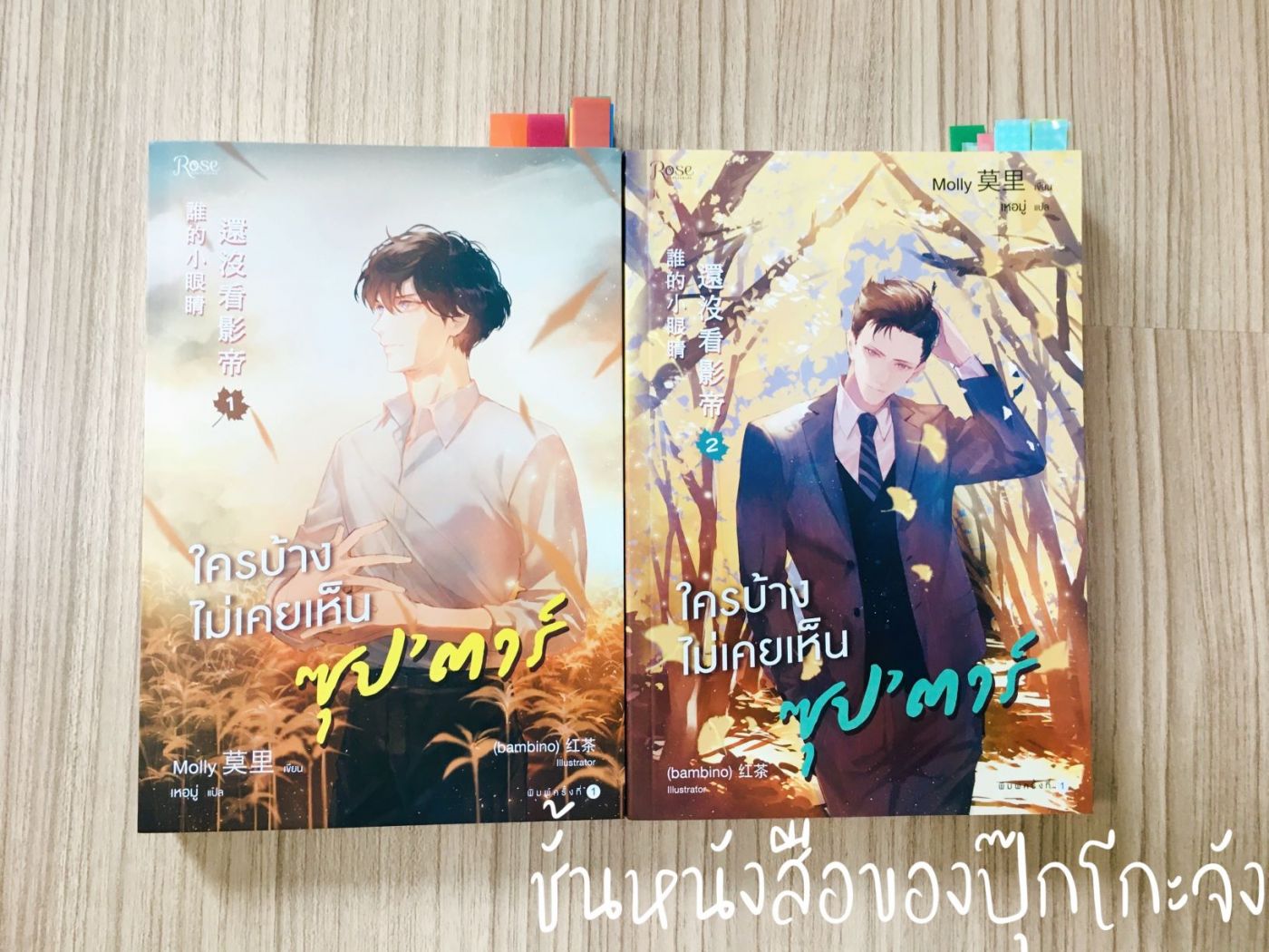 เพราะว่าเราชอบเรื่อง น้องชายที่รัก ค่อนข้างมาก พอเห็นว่ามีเรื่องใหม่ในจักรวาลเดียวกันออกมาก็เป็นอันต้องสอยโดยไม่ต้องคิดอะไรเลยค่ะ ภาพปกเน้นโทนสีเหลือง เล่มแรกเป็นทุ่งข้าวสาลี เล่มสองเป็นทิวต้นแปะก๊วยซึ่งเป็นต้นไม้ที่เราชอบมากๆ ไม่ค่อยได้เห็นปกนิยายโทนสีนี้สักเท่าไหร่ ถึงแม้หน้าตาตัวละครจะไม่ค่อยโดนแต่ชอบฉากค่ะ ทั้งสองฉากเป็น Location ที่มีความสำคัญในเรื่องนะคะ