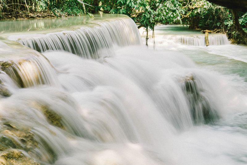 ในวันสุดท้ายที่หลวงพระบางเราแพลนกันว่าจะไปน้ำตกตาดกวางสีซึ่งอยู่ห่างจากตัวเมืองหลวงพระบางประมาณ 30 กิโลเมตร เราเช่ามอเตอร์ไซค์จากตัวเมืองไปกัน อย่างที่รู้กันว่าเส้นทางในหลวงพระบางไม่ค่อยดีนัก แต่ก็ไม่ได้ลำบากหรือแย่ขนาดนั้น พวกเราใช้เวลาเดินทางจากตัวเมืองมายังน้ำตกประมาณ 1 ชั่วโมงโดยเพื่อนเราขี่ส่วนเราซ้อน (สบาย55555) เสียค่าเข้าน้ำตกไปคนละ 20,000 กีบ เดินเข้าไปข้างในเรื่อยๆ ต้นทางจะพบกับน้องหมีน่ารักกำลังนอนอืดอยู่ และเดินเข้าไปอีกจะเจอสายน้ำจนกระทั่งเจอน้ำตกตาดกวางสี ช่วงเวลาตอนเช้าคนยังไม่พลุกพล่านมากนักเหมาะกับการถ่ายรูปมาก เสียดายที่เราไม่ได้เล่นน้ำเอาเท้าจุ่มน้ำซักนิด แต่จริงๆก็พอมีเวลา 55555