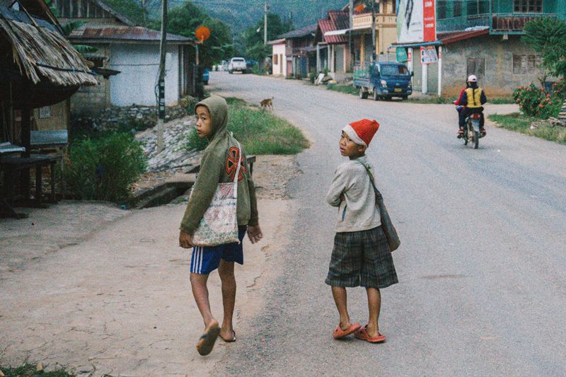 เราได้รถตู้รอบ 14.00 น. เดินทางไปยังหลวงพระบางซึ่งเป็นรถตู้แบบ open air บอกตรงๆว่าชอบมากกว่ารถตู้แอร์เสียอีก... อากาศเย็นสบายมาก ระหว่างทางมีหมู่บ้านข้างทางเป็นระยะ เรามองออกไปรอบๆพบเด็กๆ ตัวกระจ้อนกำลังเล่นกัน ในขณะที่เพื่อนเราหยิบกล้องถ่ายรูปขึ้นมาเก็บภาพบรรยากาศนั้นไว้ เด็กผู้หญิงคนหนึ่งเห็นกล้องจึงไปเรียกเพื่อนให้มาดู เด็กคนนึงทำท่าอะไรไม่รู้แต่ดูแล้วน่ารักพอตัวก่อนจะวิ่งหลบหนีไป เด็กพวกนี้ดูไม่ปรุงแต่ง ไร้เดียงสาดี มองมาที่ตัวเราแล้วปรุงแต่งอะไรมาบ้างนะ?