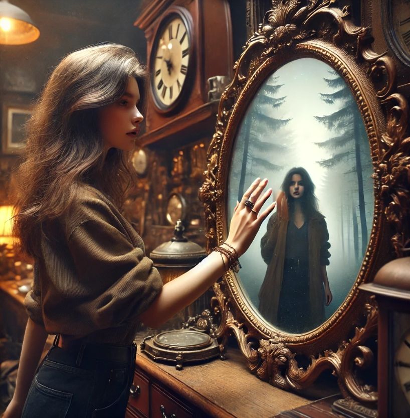 ภาพสะท้อนของเธอหายไป ในกระจกไม่มีอีริน ไม่มีร้านขายของเก่า ไม่มีแสงไฟสะท้อนกลับมา มีเพียง... ป่า! ป่าที่มืดสลัว มีหมอกสีเงินจาง ๆ ลอยอยู่