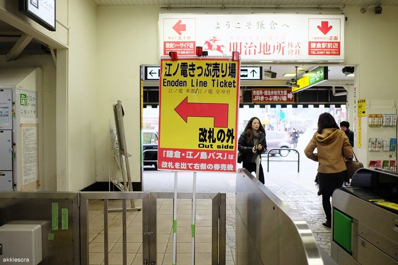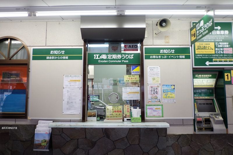 ท้องอิ่มแล้วก็ขอบคุณคุณป้า เดินออกจากร้านเพื่อมองหาทางไปนั่งรถไฟ Enoden มองซ้ายมองขวาก็เห็นป้ายชี้บอกว่าต้องมาซื้อตั๋วตรงนี้นะ ตอนแรกก็งงนิดหน่อย สรุปคือต้องแปะบัตรกวิ้นออกมาจากสถานีก่อนแล้วไปซื้อตั๋วใหม่นั่นเอง สำหรับพวกนักท่องเที่ยวอย่างเรา ๆ ที่จะลงไปดูหลาย ๆ สถานีนั้น ซื้อ Enoden Pass จะคุ้มค่ากว่ามาก ๆ เพราะราคา 600 เยน สำหรับผู้ใหญ่ (เด็ก ราคา 300 เยน) สามารถใช้ได้ทั้งวัน เราเลยเดินออกไปซื้อ วิธีซื้อสามารถซื้อจากนายสถานีก็ได้ หรือกดซื้อเอาจากตู้ก็ได้