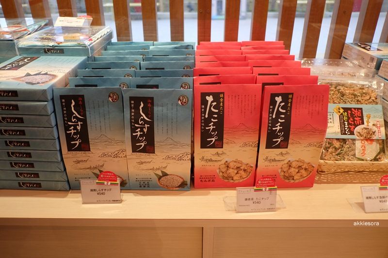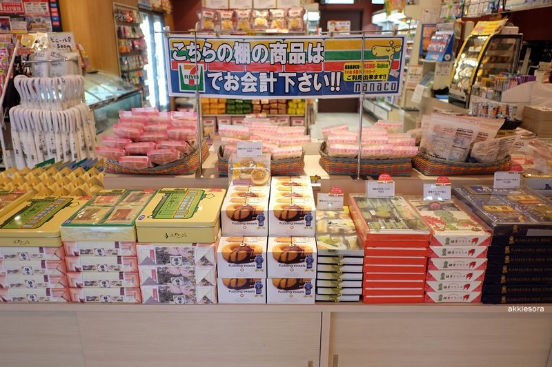 ระหว่างรอรถไฟมาก็เดินสำรวจ ใกล้ชานชาลามี 7-11 และร้านขายของฝาก ร้านยังเปิดไม่หมดทุกส่วนเพราะยังเช้าอยู่(มั้ง) ตรงที่เปิดแล้วจะเป็นพื้นที่ของ 7-11 กล่องขนมส่วนใหญ่จะเป็นรูปรถไฟ Enoden และมีพวกผลิตภัณฑ์จากปลาชิราสึซึ่งเป็นของขึ้นชื่อของเมือง