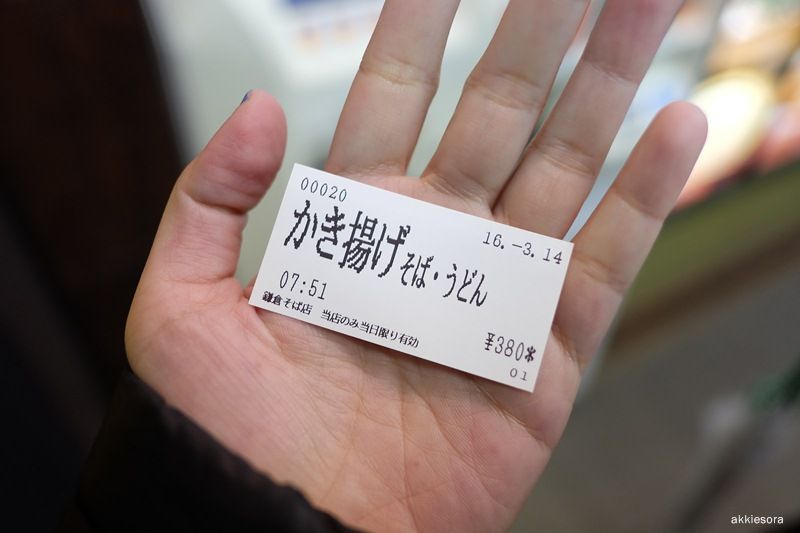 พอเข้าไปในร้านก็เอาคูปองให้คุณป้า ในร้านมีคุณป้าแค่คนเดียว แกทำทุกอย่างเลย เรากับพี่เลือกนั่งตรงบาร์ใกล้ประตูนั่นแหละ ป้าก็ถามว่าเอาโซบะใช่ไหม เราก็ ไฮ่ (ตอนนั้นคือกูเอาอะไรก็ได้ที่มันร้อน) นั่งรอไม่นานป้าก็ส่งชามร้อน ๆ มาให้ โอย… หอมมาก เราเลยทักทายป้าว่า หนาวนะคะ (ซามุ่ยยยย) ป้าก็อื้ม หนาวเนอะ แล้วป้าถามกลับมาว่าจะไปไหนกันเหรอ เราก็นั่งนึกแล้วบอกว่าจะไปสถานี Kamakurakokomae ป้าก็อ๋อ…. เอโนะเดนเหรอ เราเลยพยักหน้าแล้วบอกใช่ ๆ ป้าบอกว่า ถ้าอากาศดีนะจะเห็นฟูจิซังด้วยล่ะ วันนี้อากาศไม่ดีเลย ฝนก็ตก ความจริงแล้วเราฟังไม่ออกทั้งหมดแต่จับได้เป็นคำ ๆ บวกกับเราหาข้อมูลมาบ้างว่าริมหาดของคามาคุระสามารถมองเห็นฟูจิซังได้ในวันที่อากาศแจ่มใส ตอนนั้นรู้สึกดีใจมากที่ป้ามีปฏิสัมพันธ์อันดีกับนักท่องเที่ยวหน้ามึนอย่างเรา หลังจากนั้นจึงลงมือจัดการโซบะ โอ๊ยยยย อร่อยมากอ่ะ โซบะร้อน ๆ ในวันอากาศหนาวเหน็บนี่มันดีจริง ๆ ใครไปสถานีคามาคุระหลังจากนี้เราฝากทักทายป้าด้วยนะ