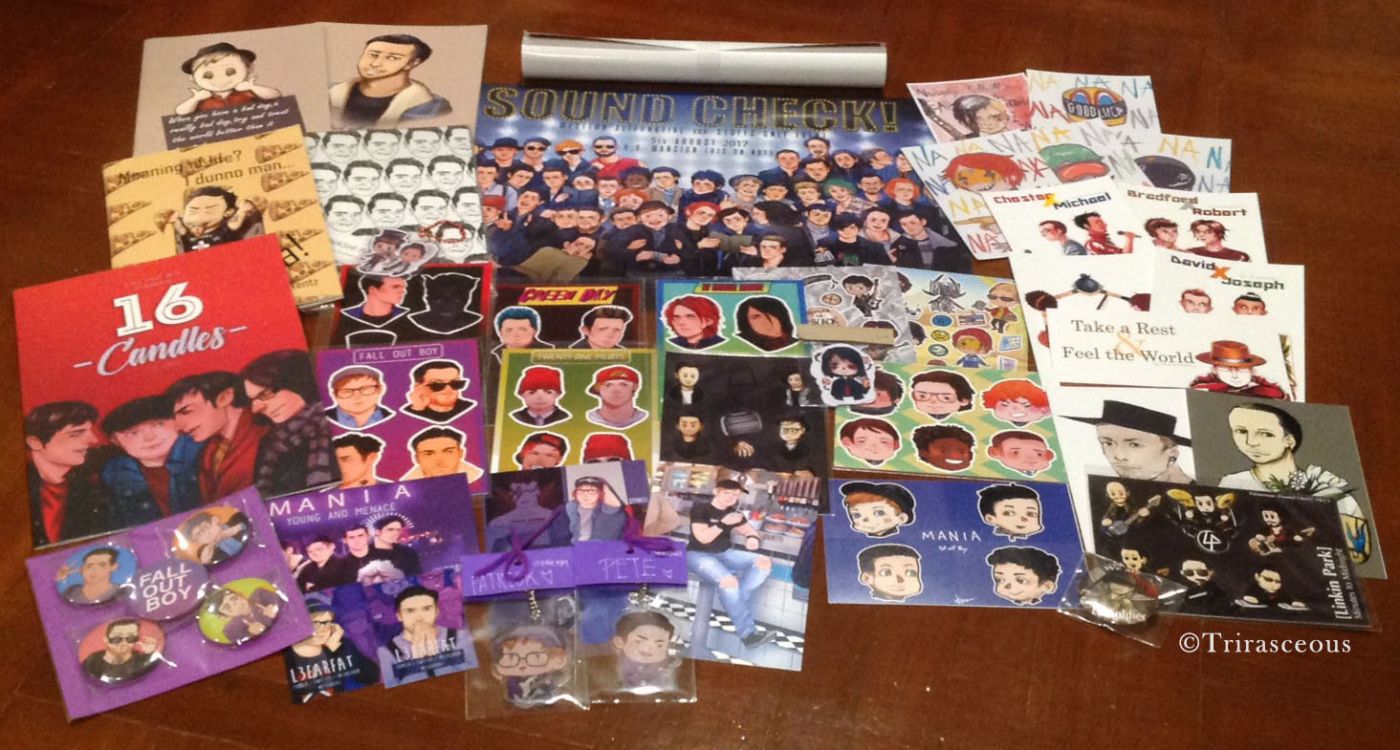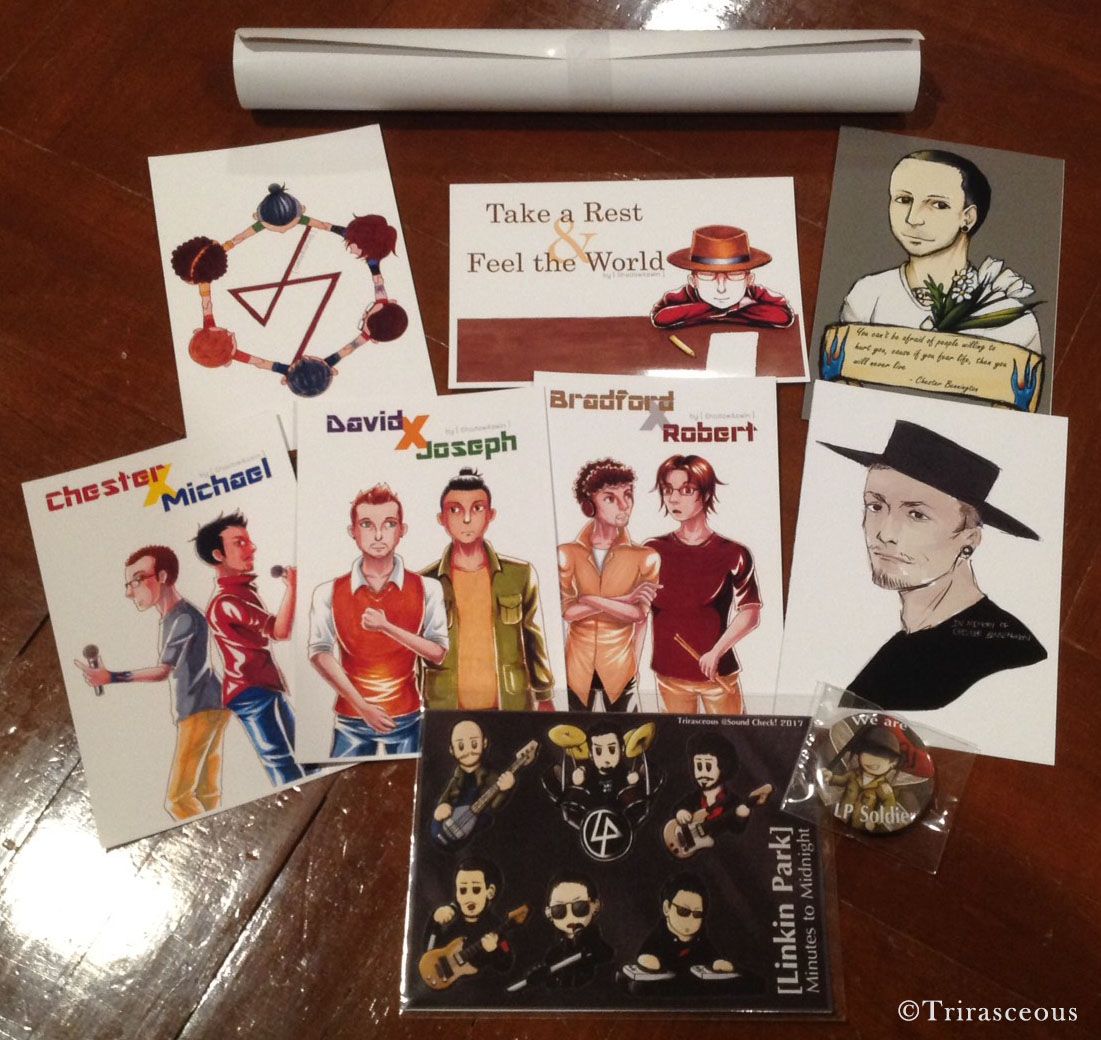 - โปสการ์ดและโปสเตอร์จากเซอร์เคิล ShadowAswin เป็นโปสการ์ดรูปคู่ของสมาชิกในวงแบ่งเป็นสามคู่ และรูปรวมอีกหนึ่ง (เราชอบอันนี้มากๆ คือมาจากคอนเซปต์สัญลักษณ์วงในยุค One More Light ที่เป็นรูปมือ อันนี้เป็นสมาชิกยืนจับมือกันเป็นสัญลักษณ์ของวงค่ะ) นอกจากนี้ยังได้โปสการ์ดแถม (พี่คนวาดเขาเอามาฝากเรา สเปเชี่ยล แลกกับนิตยสารปกเชสเตอร์ที่เราเอาไปให้ในงาน แฟนคลับแอลพี ช่วยๆกันค่ะ! :3 ) ข้างบนนี้มีโปสการ์ดลิงกินผักอีก แต่เรายังไม่ได้แกะออกมา (แหะๆ) เป็นLinkin Park ในเส้นลายไทยค่ะ โดยบูทของพี่เขาจะบริจาครายได้ที่ได้จากการขายของในบูทให้กับโรงพยาบาลศิริราชหมดเลยเพื่อป๋าเชสด้วย