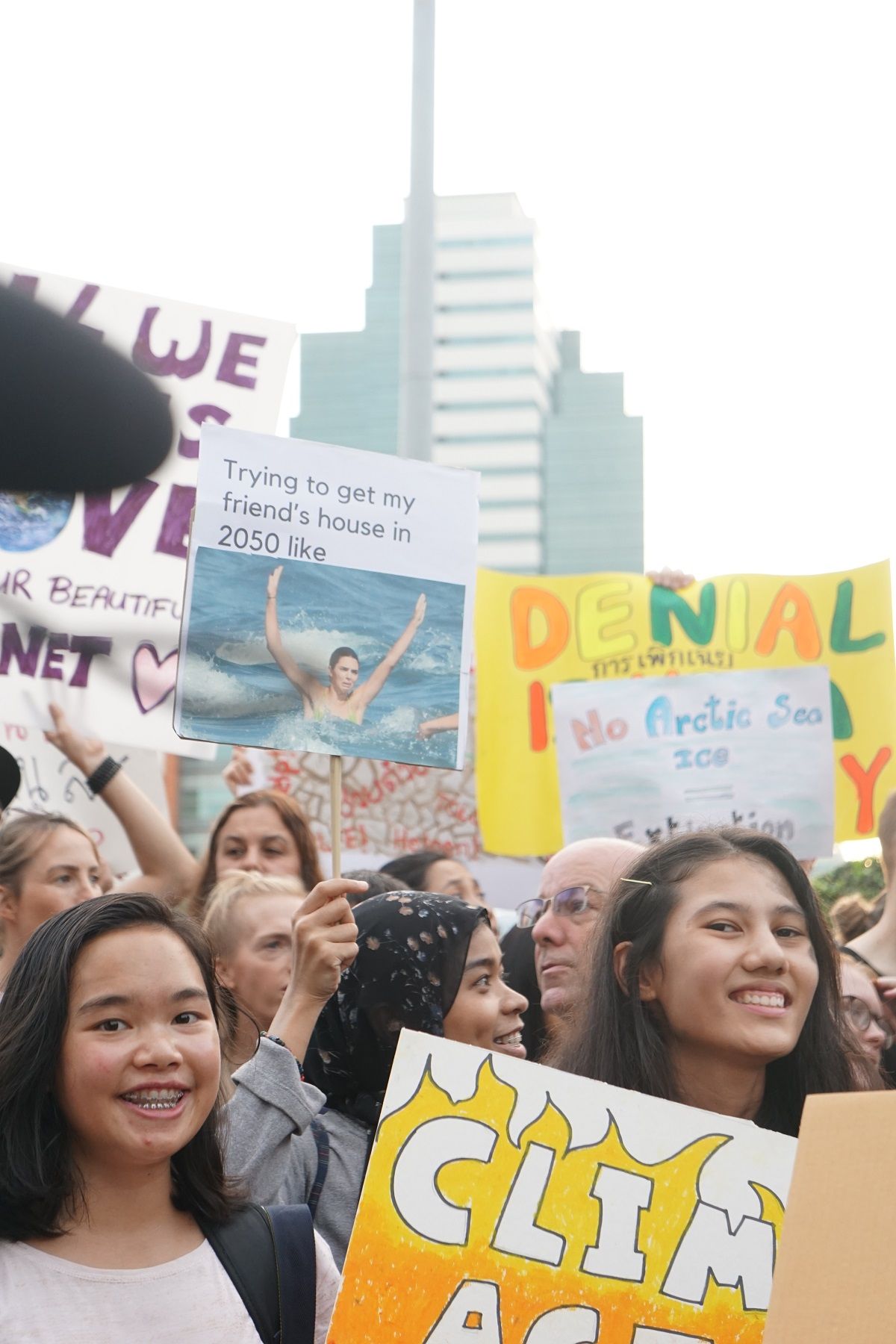 “อย่างครั้งแรกที่ไป ก็เป็นป้ายที่บอกว่า 'We hear you Greta*.' แบบฉันได้ยินเธอนะ สิ่งที่คุณพูดมา ตั้งแต่ตอนที่คุณไปประชุม เราได้ยินเสียงคุณนะ หรือป้ายที่สองก็คือ 'The planet is hotter than Justin Bieber.' แค่อยากทำให้คนรู้ว่าตอนนี้โลกของเรามันร้อน ส่วนครั้งที่สามเราถือป้ายที่บอกว่า ตอนนี้โลกต้องการให้พวกคุณแคร์ คุณต้องแคร์โลกให้มาก ๆ โดยที่เราไม่ต้องสื่อถึงเรื่องอะไรเลย ส่วนรอบนี้เราแค่บอกว่า 'ในปี 2050 เราจะต้องว่ายน้ำไปบ้านเพื่อน' เราแค่ทำให้เขาเห็นว่า เฮ้ย! วิกฤตมันจะเกิดขึ้น”