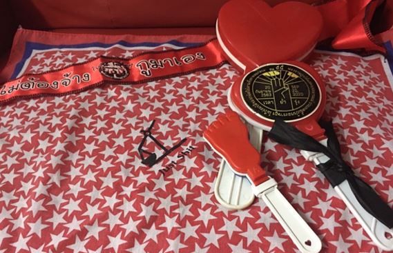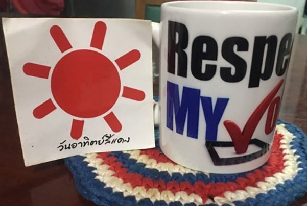 “ก็ไม่มีการชุมนุมที่กรุงเทพประมาณ 1 เดือน เพราะพ.ร.ก. แต่ไปชุมนุมที่ต่างจังหวัดแทน ซึ่งป้าเองก็ได้ติดตามไปทั้งอยุธยา กาญจนบุรี   จนกระทั่งยกเลิกพ.ร.ก. ก็มีนัดชุมนุมอีกครั้งที่สนามหลวง คนก็เดินทางไปร่วมกันแน่นขนัด แกนนำใหญ่ ๆ ก็โดนจับจนหมดแล้ว”สติ๊กเกอร์วันอาทิตย์สีแดงและแก้วน้ำ Respect My Vote