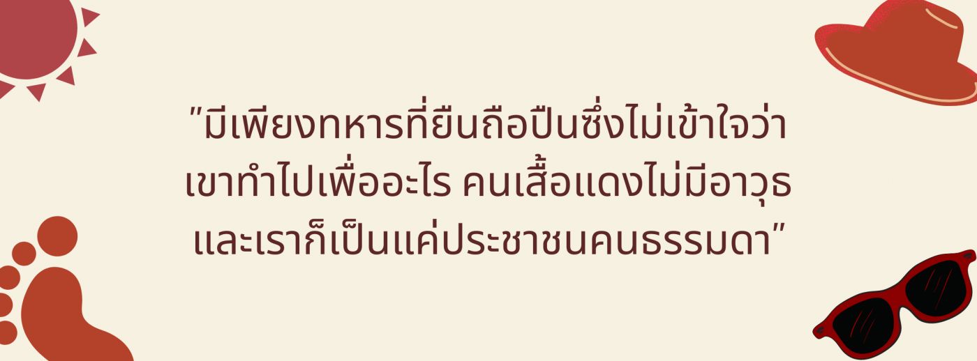 “ช่วงการต่อสู้ของคนเสื้อแดง ตอนนั้นป้าเองก็ยังไม่ได้รู้ว่าบ้านเมืองเกิดอะไรขึ้น ก็ได้แต่สงสัยว่า ทำไมไม่มีข่าวม็อบของคนเสื้อแดงในหน้าหนังสือพิมพ์สักฉบับ พอย้อนกลับไปช่วงรัฐประหารสมัยทักษิณ ปี 2549 ที่คนจำนวนมากออกไปประท้วงกันที่สนามหลวงตั้งแต่สองสามวันหลังการรัฐประหารโดยสนธิบัง (สนธิ บุญยรัตกลิน) [1] ป้าเองก็เข้าร่วมด้วยเช่นกัน ปรากฏว่า ก็ไม่มีข่าวบนหน้าหนังสือพิมพ์สักฉบับด้วยเหมือนกัน ยิ่งในยุคนั้นที่ไม่มีโซเชียล คนส่วนใหญ่รับข้อมูลข่าวสารผ่านหนังสือพิมพ์เป็นหลัก ป้าเองก็ด้วย”