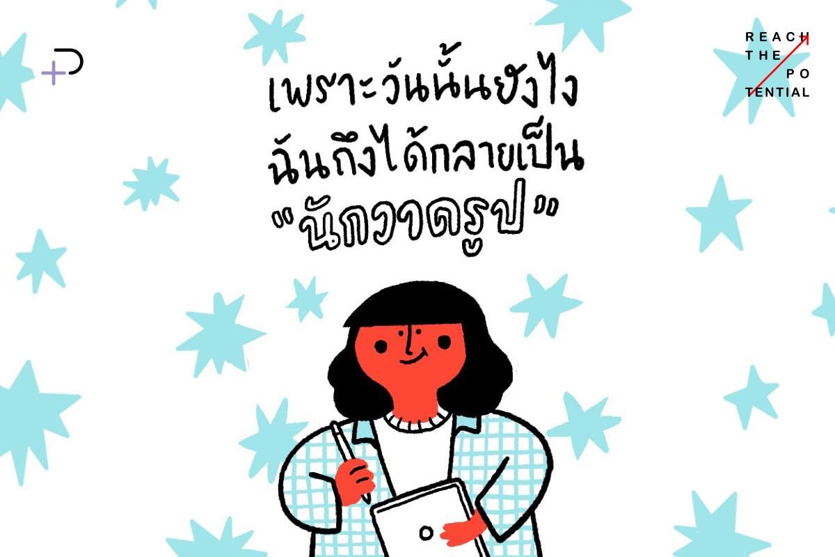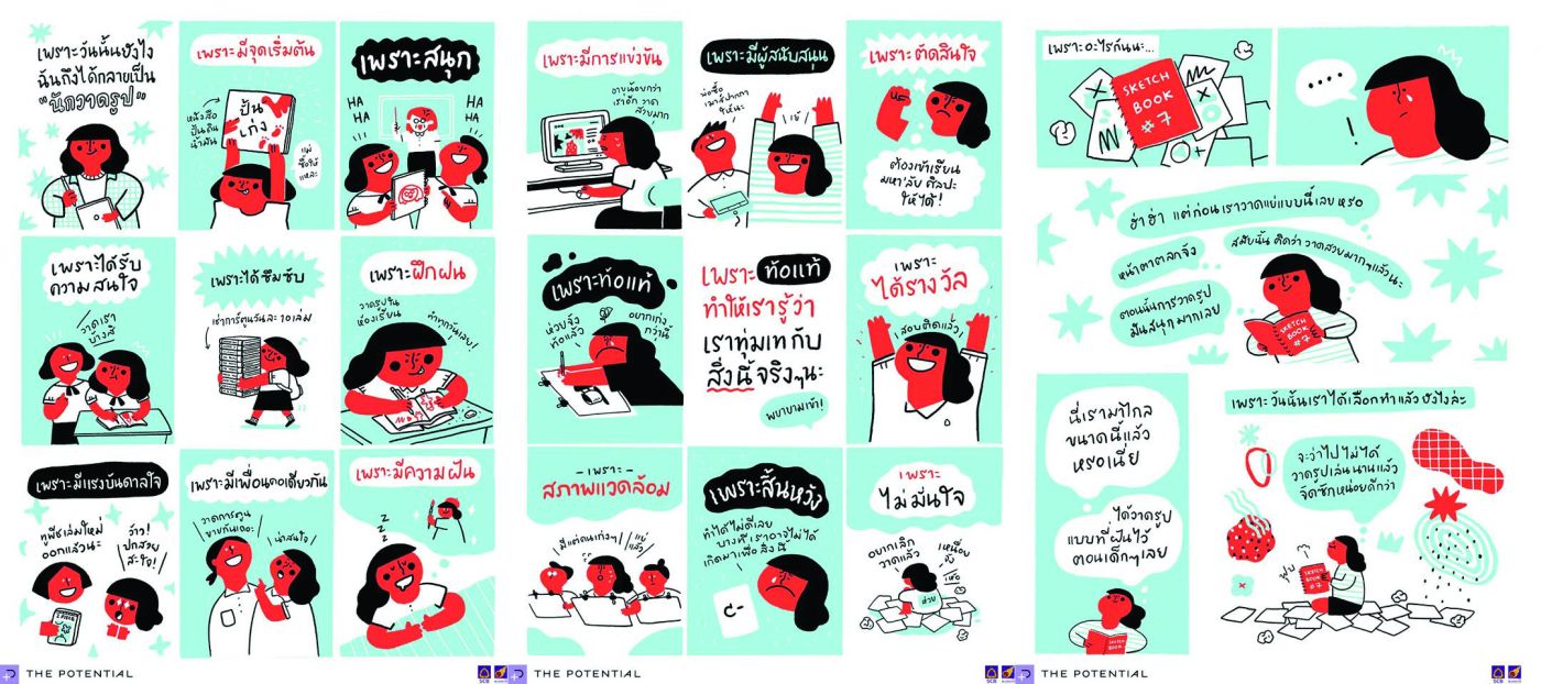 “เราจำได้ว่าตอนที่เราโพสต์การ์ตูน The Potential ลงทวิตเตอร์” ฟ้าเล่าถึงผลงานหนึ่งของเธอเมื่อไม่นานมานี้ “มีคนไปพิมพ์ในทวิตตัวเองว่า ‘คุณรู้ไหมว่าการวาดของคุณมันพิเศษขนาดไหนต่อโลกใบนี้’