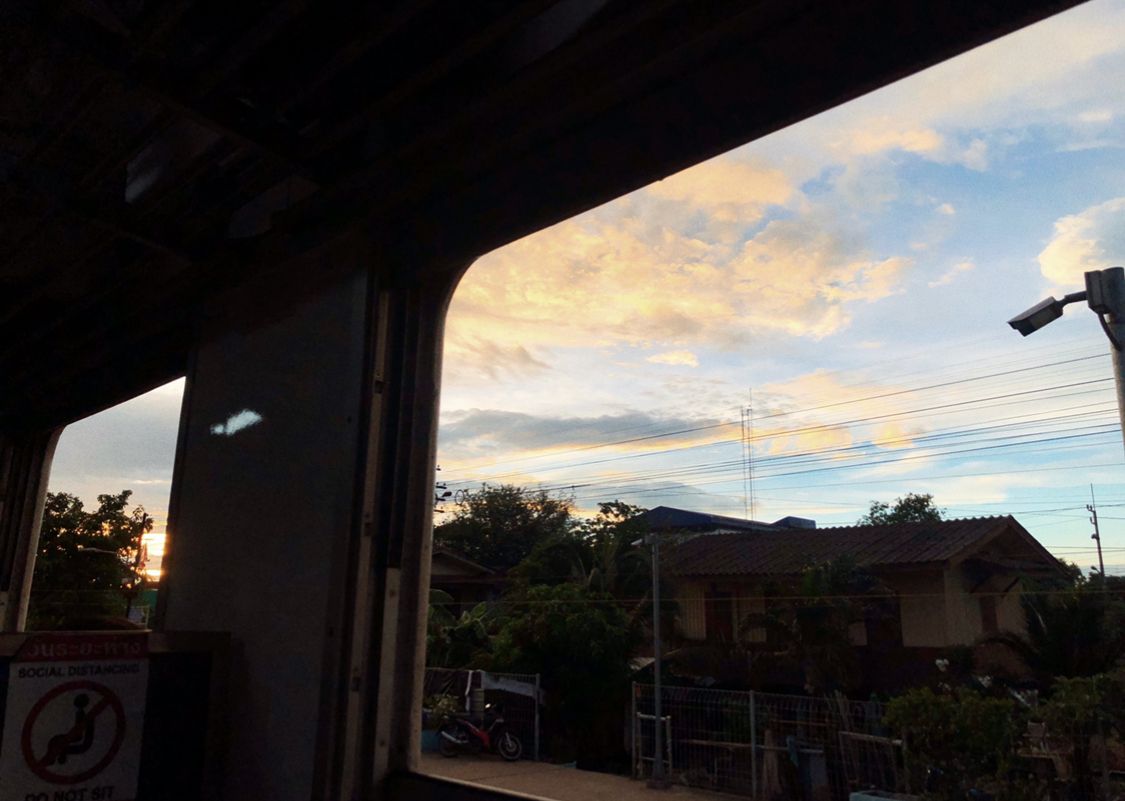 ออกจากกรุงเทพมาสักพักใหญ่ใหญ่สิ่งที่น่าตื่นเต้นที่สุดสำหรับเราก็คงเป็นท้องฟ้าของวันนี้ ช่วงเวลาระหว่างพระอาทิตย์ตกเป็นอะไรที่โรแมนติกสำหรับเรามาก แสงอาทิตย์ส่องผ่านช่องว่างถนนและเสาไฟมาตกที่ใบหน้า แสงอาทิตย์สะท้อนน้ำวิบวับมองจากมุมหน้าต่างรถไฟที่กำลังแล่นผ่านสะพานเหล็กไปพร้อมกับเสียงที่ดังกว่ารถแล่นบนรางปกติ เปรียบหน้าต่างรถไฟบานนี้เป็นกรอบรูปที่ภาพในนั้นเปลี่ยนไปตลอดเวลา พร้อมมีเสียงบรรยากาศประกอบไปด้วย