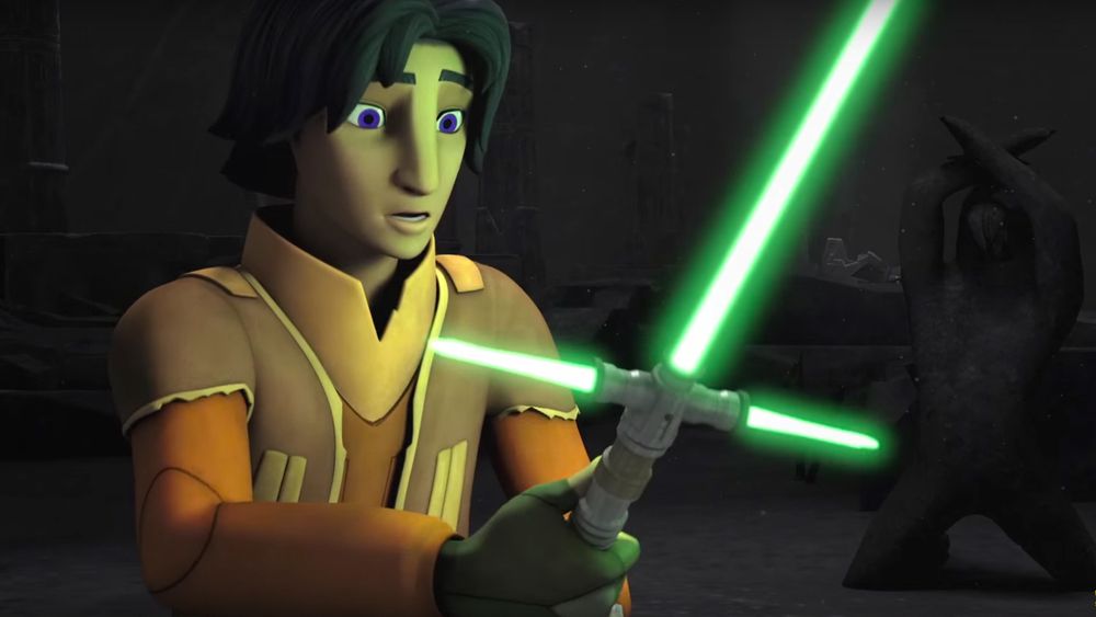 เอซรา บริดเจอร์เจอไลท์เซเบอร์โบราณที่ซิธเทมเพิล โดยที่นี่เคยเกิดการต่อสู้กันระหว่างเจไดกับซิธเมื่อหลายพันปีก่อน