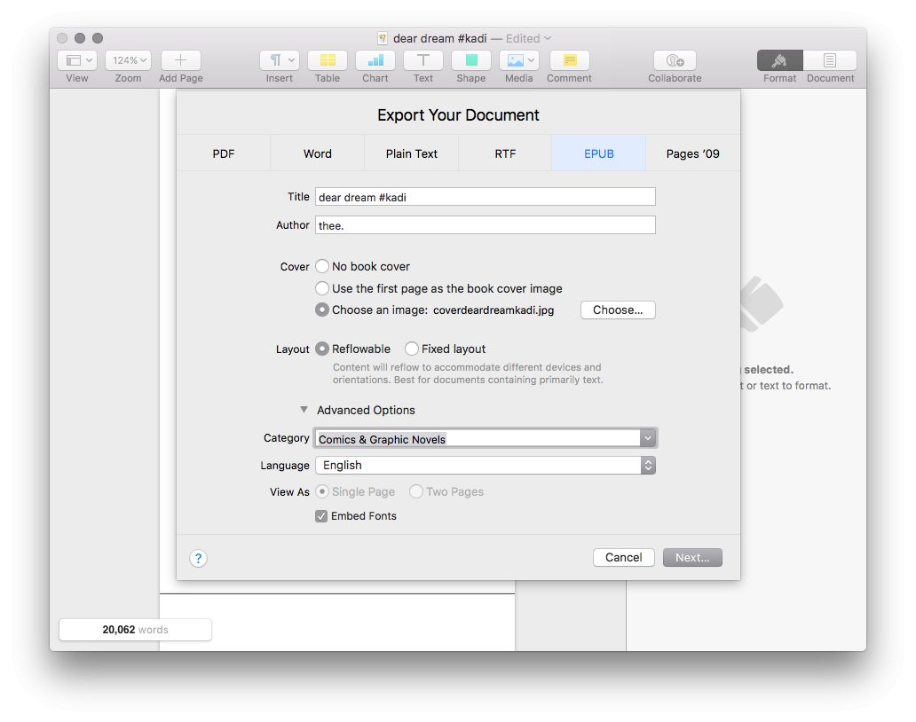 ขั้นตอนสุดท้ายของการทำ E-book. ก็คือการ Export file ออกมาเป็นไฟล์นามสกุล .epub นั่นเอง