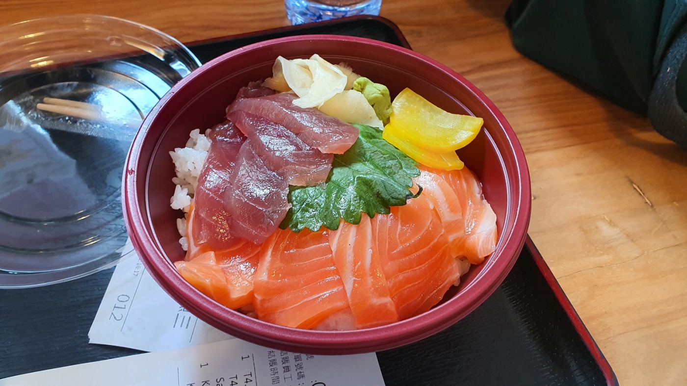 สายตาหันไปเห็นร้านอาหารญี่ปุ่นแต่ขายเป็นด้ง(ข้าวหน้าต่าง ๆ) อย่างเดียว ราคาไม่แรงด้วย เลยเลี้ยวเข้าไปและสั่งข้าวหน้าปลาดิบรวม ฉันนั่งรออยู่สักพักก็เริ่มมีมนุษย์เงินเดือนเข้ามาในร้านและแถวก็เริ่มยาว น่าจะได้เวลาพักกลางวันพอดีสินะ