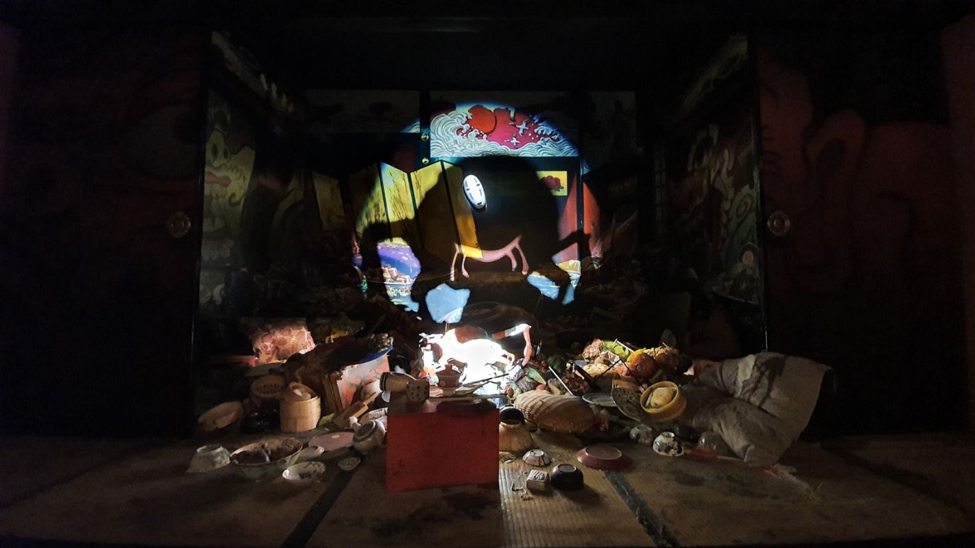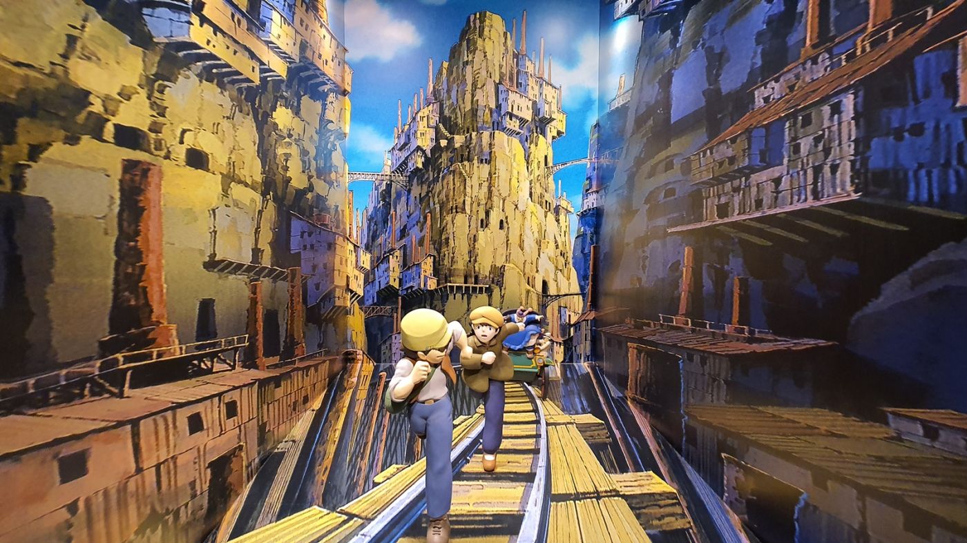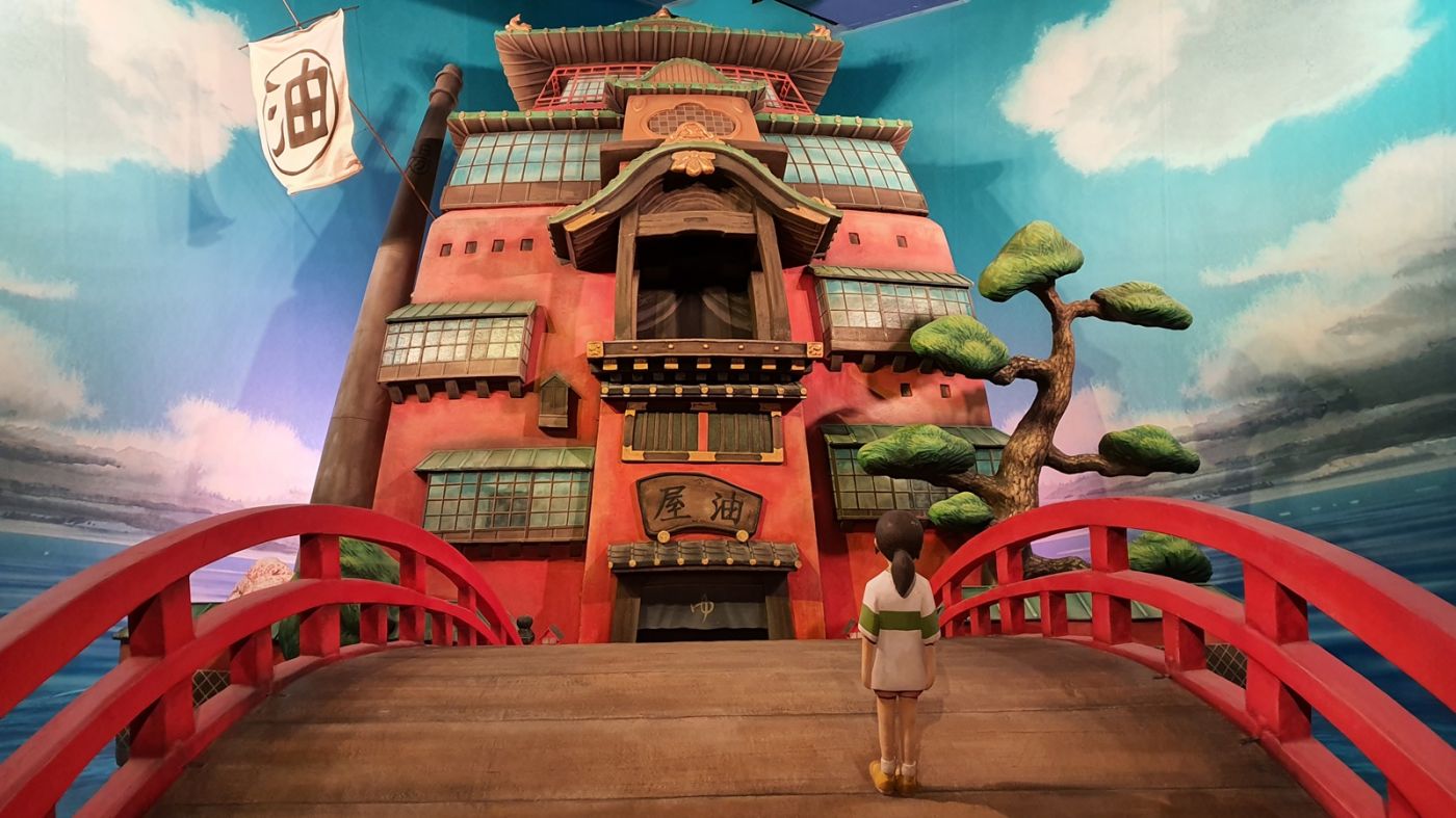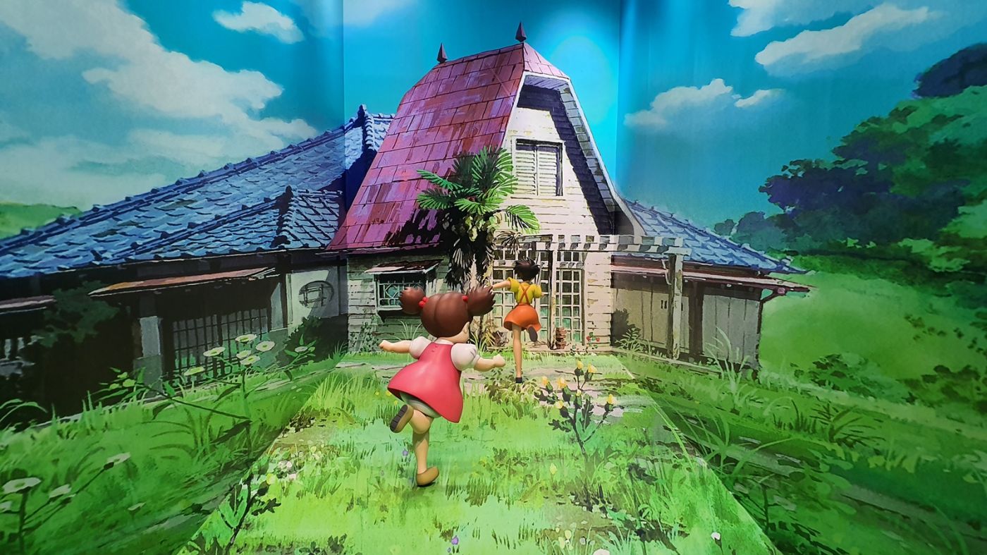 ระหว่างที่ยืนถ่ายแบคดรอปโตโตโระ พนักงานก็เดินมาช่วยถ่ายรูปให้ จนได้มา 2-3 รูป พอเข้าไปด้านในพนักงานก็จะให้ขึ้นลิฟต์แล้วเดินขึ้นบันไดไปอีกชั้น พื้นที่จัดแสดงจะแยกเป็นห้อง ห้องละเรื่อง และมีไม่ครบทุกเรื่อง ส่วนใหญ่เป็นเรื่องดังและเรื่องเก่า ๆ โดยเริ่มต้นจาก Pom Poko , Kiki's Delivery Dervice , Howl's Moving Castle , Porco Rosso , Princess Mononoke , Spirited Away ,Nausicaä of the Valley of the Wind และปิดท้ายด้วย My NeighborTotoro