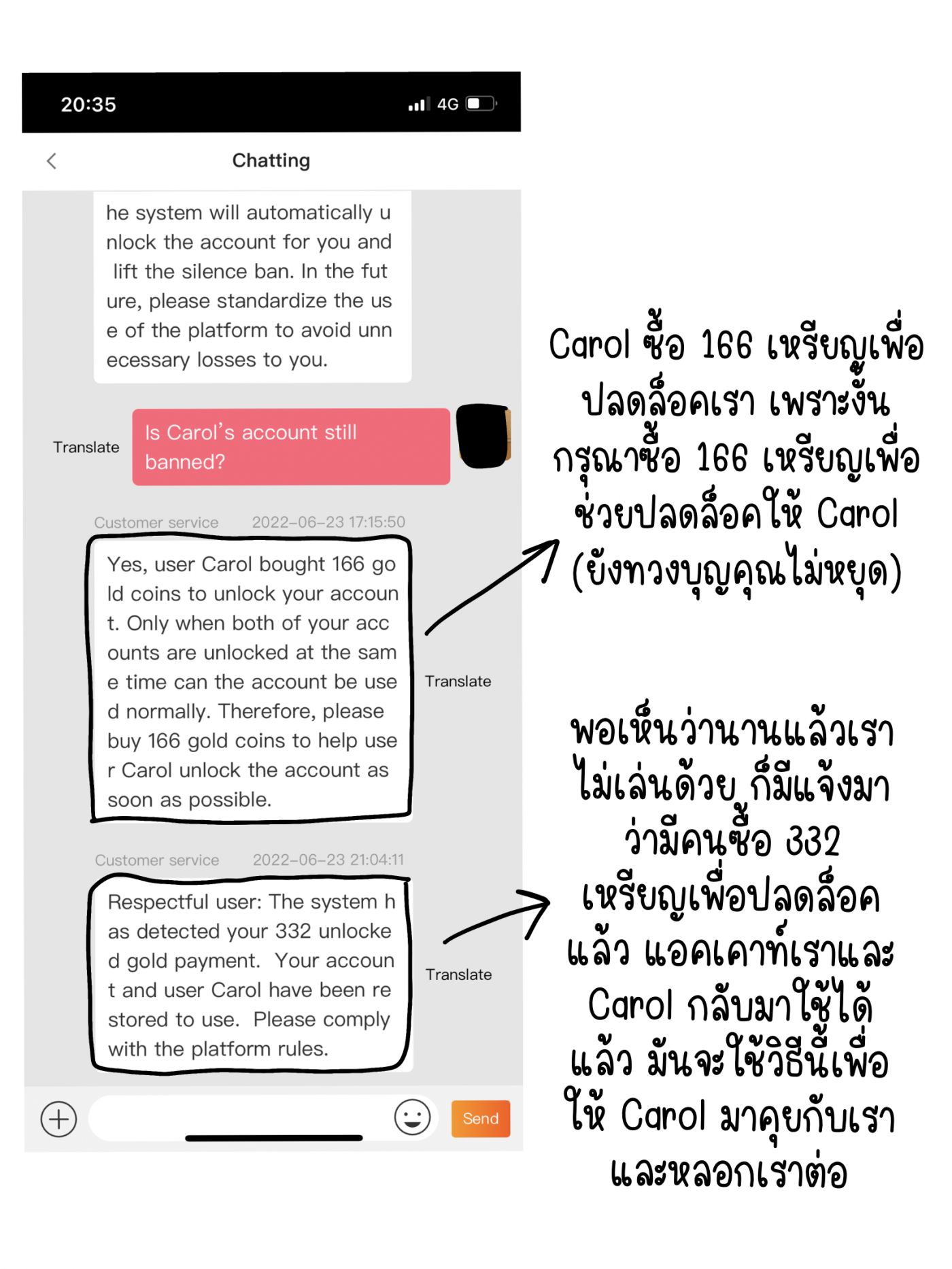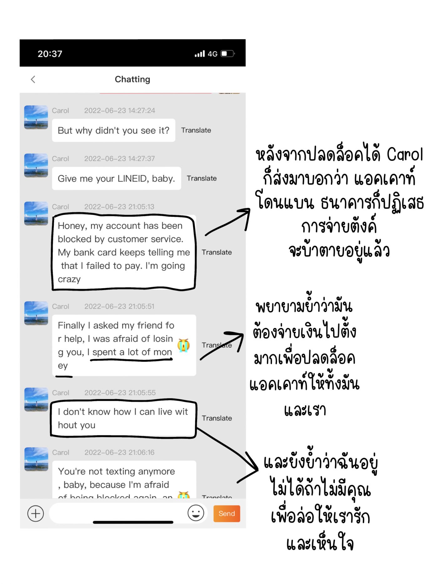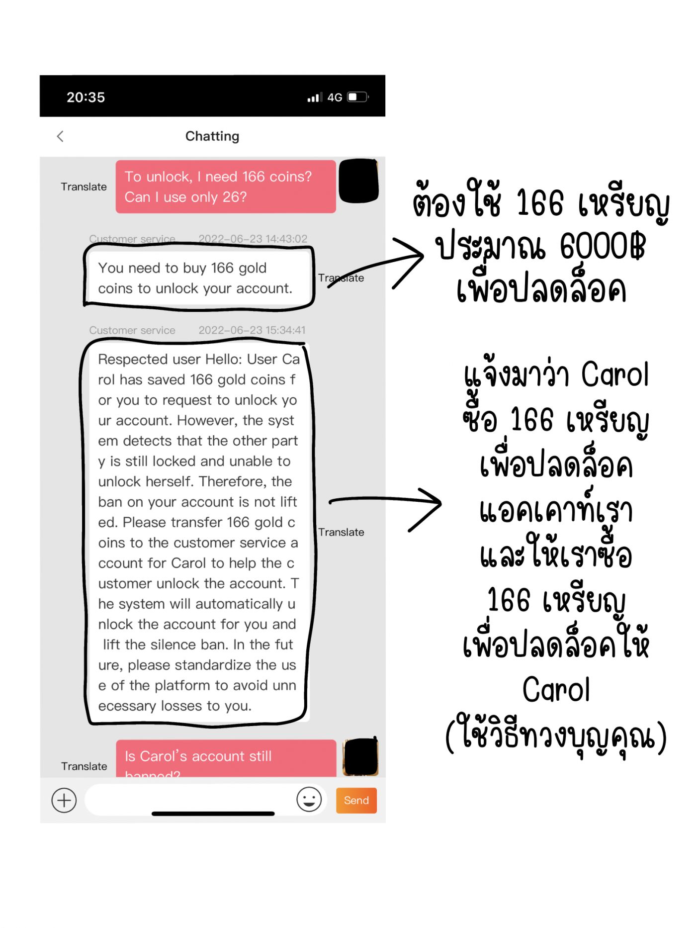 พอวันต่อมามันก็บอกเราว่ามือถือหาย ตอนนี้ใช้มือถือเพื่อนอยู่ บอกว่ามันไม่เหลืออะไรแล้ว เหลือแค่เราคนเดียว (แหวะ จะอ้วก) เราเลยพิมพ์เบอร์มือถือเราไป บอกว่าเผื่อมีอะไรให้ช่วยเหลือก็โทรมานะ สรุปว่าส่งไปแล้วแอพมันลบข้อความนั้นอัตโนมัติเลยว่ะ มันก็เริ่มทำทีเป็นร้อนรน รีบๆ เพื่อให้เราไม่มีเวลาฉุกคิด มันก็ขอ Zoom id ของเรา เราก็ให้ไป ข้อความก็โดนลบไปอีก มันขอ Line id เรา (เอ๊ะ ขอไปทำไมอีกวะ ก็เพิ่งแอดไลน์กันวันนั้น) เราก็บอกไป แล้วข้อความก็ถูกลบอีก ทีนี้ทาง Customer Service ก็จะแจ้งมาว่า เราทำผิดกฎของแอพ (ไม่มี policy ใดๆให้อ่านก่อนด้วย) แอคเคาท์เรากับ Carol ถูกแบนชั่วคราว ต้องจ่ายอีก 166 เหรียญเพื่อปลดการแบน