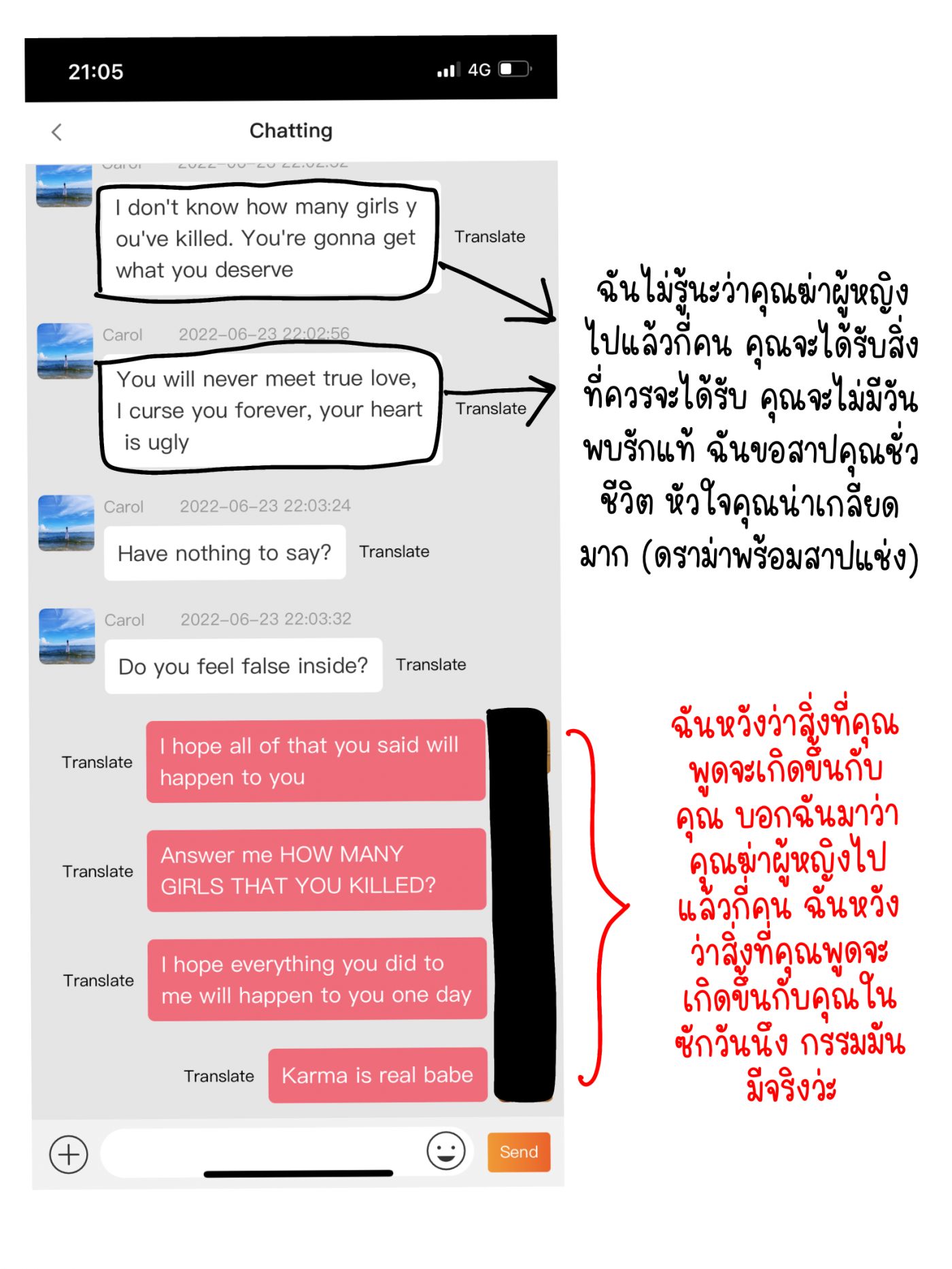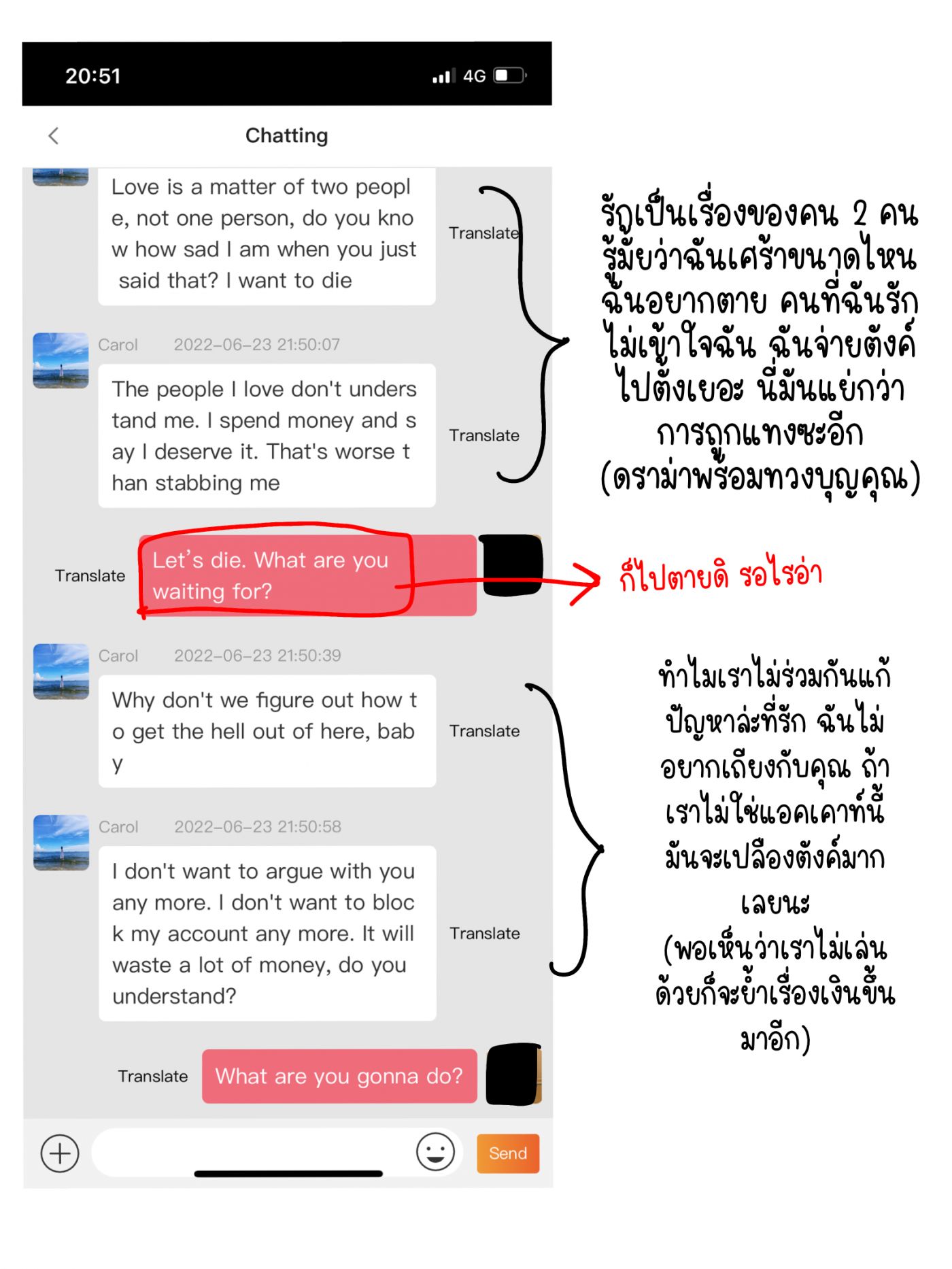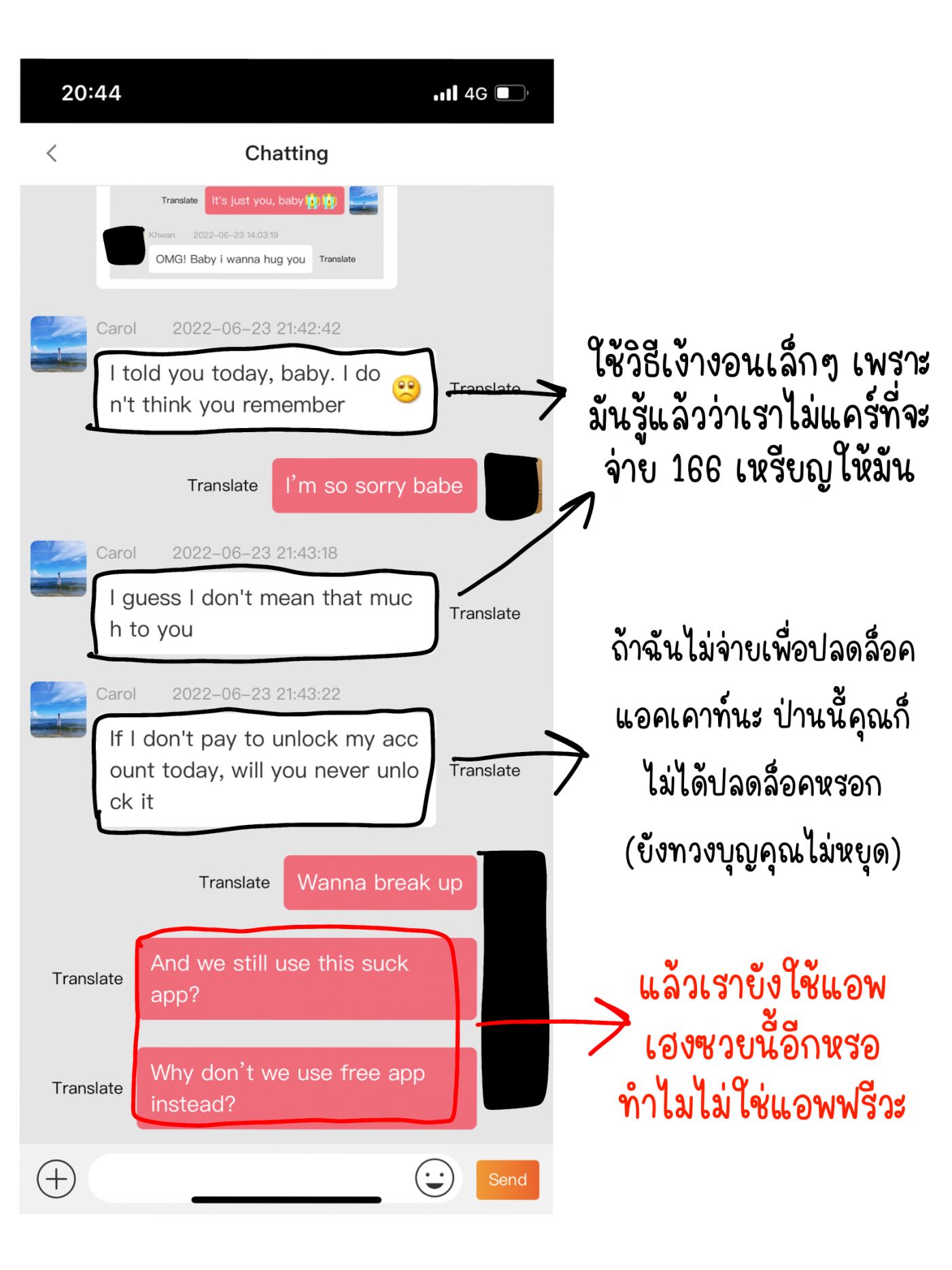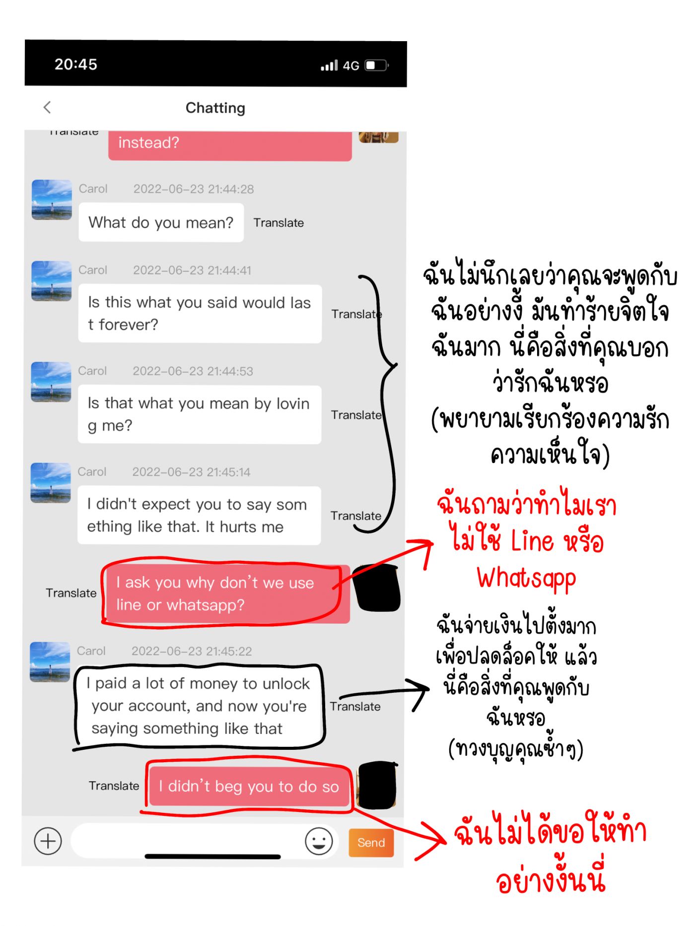 พอวันต่อมามันก็บอกเราว่ามือถือหาย ตอนนี้ใช้มือถือเพื่อนอยู่ บอกว่ามันไม่เหลืออะไรแล้ว เหลือแค่เราคนเดียว (แหวะ จะอ้วก) เราเลยพิมพ์เบอร์มือถือเราไป บอกว่าเผื่อมีอะไรให้ช่วยเหลือก็โทรมานะ สรุปว่าส่งไปแล้วแอพมันลบข้อความนั้นอัตโนมัติเลยว่ะ มันก็เริ่มทำทีเป็นร้อนรน รีบๆ เพื่อให้เราไม่มีเวลาฉุกคิด มันก็ขอ Zoom id ของเรา เราก็ให้ไป ข้อความก็โดนลบไปอีก มันขอ Line id เรา (เอ๊ะ ขอไปทำไมอีกวะ ก็เพิ่งแอดไลน์กันวันนั้น) เราก็บอกไป แล้วข้อความก็ถูกลบอีก ทีนี้ทาง Customer Service ก็จะแจ้งมาว่า เราทำผิดกฎของแอพ (ไม่มี policy ใดๆให้อ่านก่อนด้วย) แอคเคาท์เรากับ Carol ถูกแบนชั่วคราว ต้องจ่ายอีก 166 เหรียญเพื่อปลดการแบน