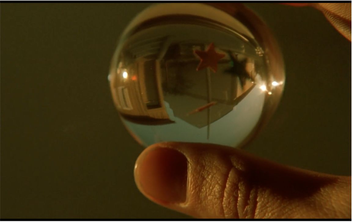 ภาพต่อมาคือภาพดวงตาสะท้อนในกระจก ก่อนจะปรากฏตัวขึ้นเป็นเด็กสาวนั่งมองดูใบไม้ตามเสียงบรรยายที่ผู้พูดไม่ได้ปรากฏขึ้นบนจอเลยนอกจากดวงตาข้างเดียว ทั้งนี้การบรรยายทั้งสองใช้คนละภาษาทำให้อนุมานได้ว่าเด็กสาวทั้งสองไม่ใช่คนเดียวกัน สารัตถะสำคัญคือฉากเปิดเรื่องก่อนเข้าสู่ชื่อเรื่องล้วนสัมพันธ์กับ “การมอง” อย่างการมองในภาพแรก เมื่อตึกรามอาคารสูงที่เห็นอยู่ทุกเมื่อเชื่อวันต้องอยู่ภายใต้ท้องฟ้าจากการถูกพลิกกลับให้สลับตำแหน่งแห่งที่และเด็กสาวที่กำลังฟังผู้ที่น่าจะเป็นมารดาของเธอสอนวิธีการมองดูลักษณะใบไม้ ผู้ชมยังประจักษ์ดวงตาของผู้น่าจะเป็นมารดาสะท้อนบนกระจกซึ่งใช้พื้นที่บนจอไปอย่างมหาศาล อาจกล่าวได้ว่า “การมอง” โดยนัยกำลังถูกเข้ามากำกับจัดการแต่ต้นเรื่องเพื่อวางรากหลอมชุดตรรกะใหม่ในโลกสัจนิยมมหัศจรรย์ที่ผู้ชมยังสามารถมองเมืองอยู่บนดินและดาวระยับอยู่เหนือหัวเพียงแต่ถูกปลดทัศนะเชิงสัจนิยมให้ความมหัศจรรย์เข้ามาหมุนเปลี่ยนตามที่Alejo Carpentier นักเขียนนวนิยายชาวคิวบาตั้งข้อสังเกตไว้ในบทความ The Baroque and the Marvelous Real ว่า“[สิ่งที่ Roh เรียกว่าสัจนิยมมหัศจรรย์นั้นคือ] ... จิตรกรรมที่นำรูปทรงเหมือนจริงมาประกอบกันเข้าในลักษณะสวนทางกับความเป็นจริงในชีวิตประจำวัน...” (ชูศักดิ์ ภัทรกุลวณิชย์, 2016, p.21) กล่าวคือ ภาพตามการรับรู้เดิมถูกถอดออกแล้วถูกนำใส่กลับในรูปแบบสวนสลับกับศิลปะสัจนิยมกลายเป็นเมืองอยู่ด้านบน ฟ้าอยู่ด้านล่างผิดแผกจากความเป็นจริงในชีวิตประจำวันนั่นเอง