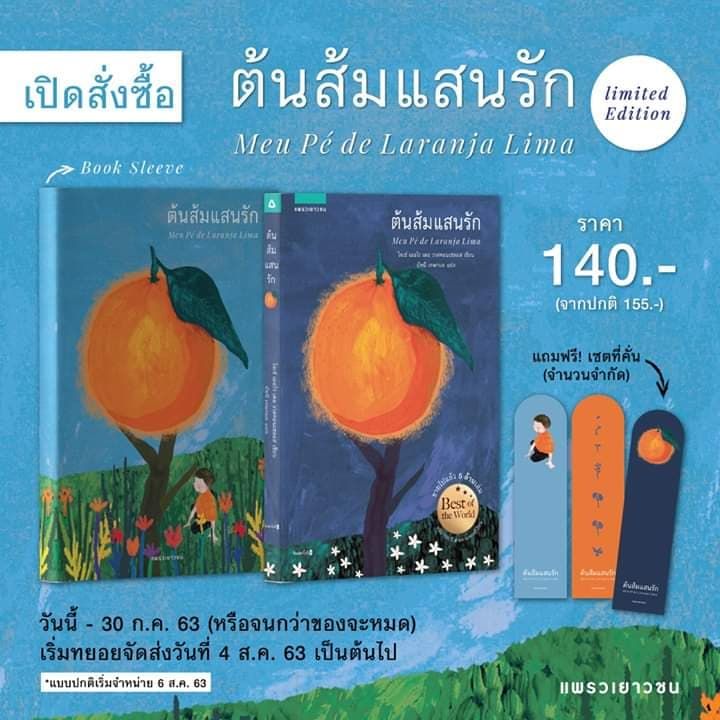 และตอนนี้ ต้นส้มแสนรักก็เปิดให้คุณนักอ่านทุกท่านเปิดพรีออเดอร์ในราคา 140 บาท จากปกติ 155 บาททางเว็บไซต์ออนไลน์ ร้านหนังสือต่าง ๆ รวมถึงสั่งซื้อผ่าน inbox เพจแพรวนิยายแปล ค่ะ