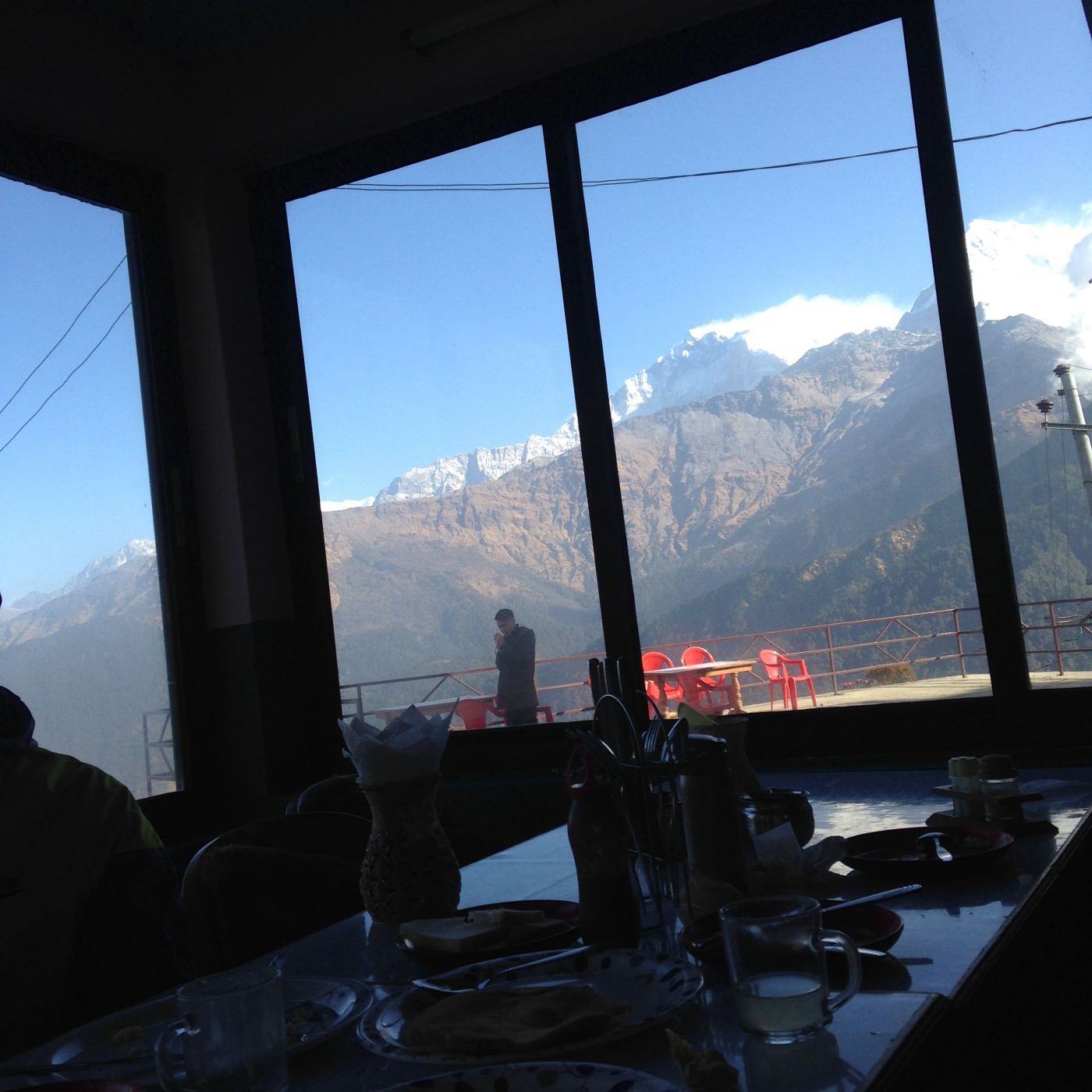 วิวจากโต๊ะอาหาร กระจกห้องอาหารที่นี่เป็นกระจกใส มองหิมาลัยได้รอบ ๆ เลยเช้านี้เราสั่งแพนเค้กกล้วยกิน กับชาดำ 1 แก้ว และเติมน้ำเปล่าเต็มขวด 1 ขวด พอถึงเวลาเช็คบิลทุกอย่างก็เห็นว่า ในใบเสร็จไม่มีค่าห้องเลย ถามซอบินว่าทำไมไม่มีค่าห้อง ซอบินก็บอกว่าจ่ายไปแล้ว เรางงมาก ไม่รู้ว่าเป็นการดีลพิเศษของลูกพี่ลูกน้องซอบิน หรือซอบิน หรือใครจ่าย หรือส่วนลดอะไรไม่รู้ แต่ที่แน่ ๆ คือเราไม่ได้จ่ายค่าที่พักคืนนี้ ที่พักที่วิวสวยที่สุดของทริปนี้เนี่ย ต้องขอบคุณกันยกใหญ่
