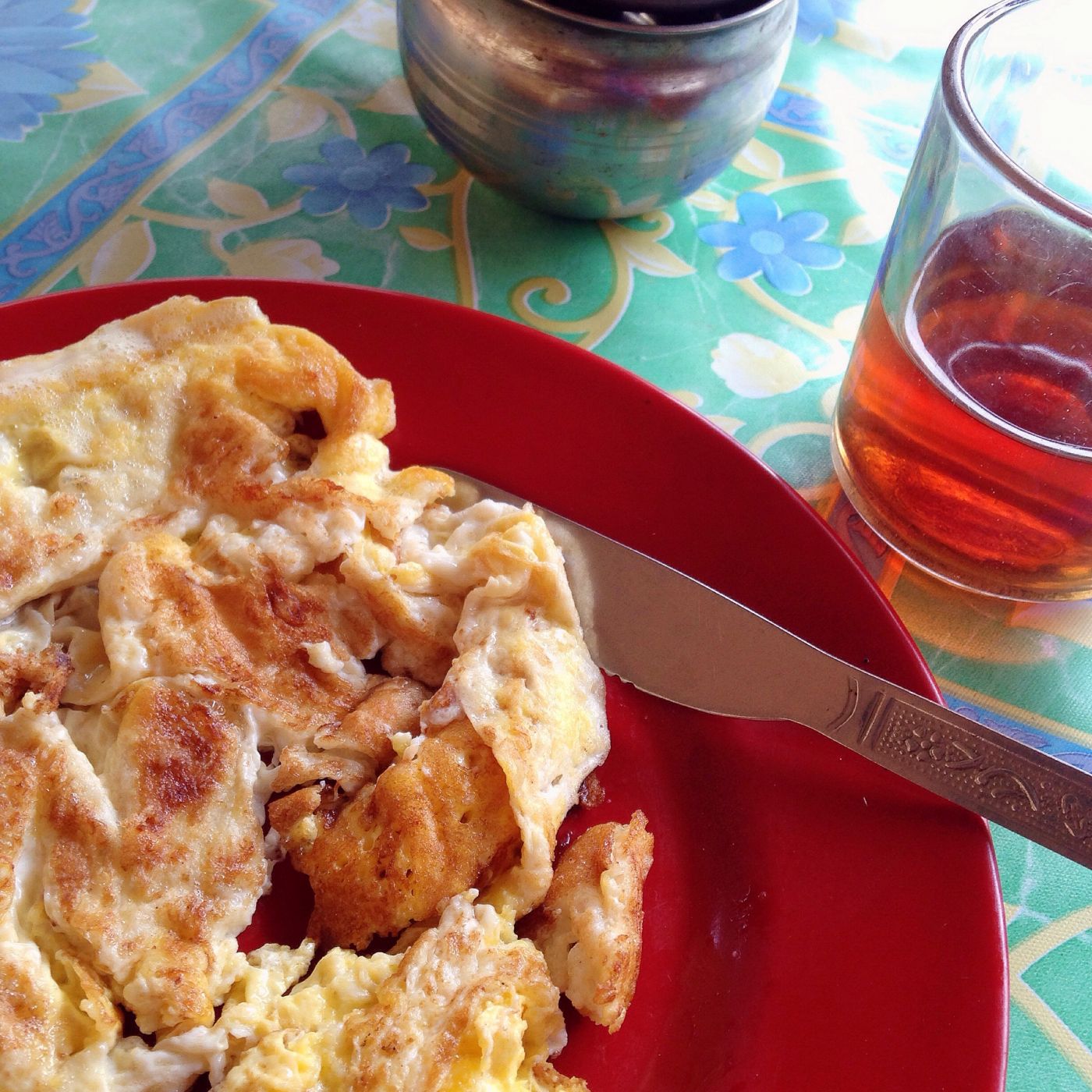 มื้อแรกของการเทรค เราสั่งแค่ไข่เจียวกับชาดำ แล้วก็เอาอาหารสำเร็จรูปที่พกไปมากินกับไข่เจียว และออกเดินทางต่อ