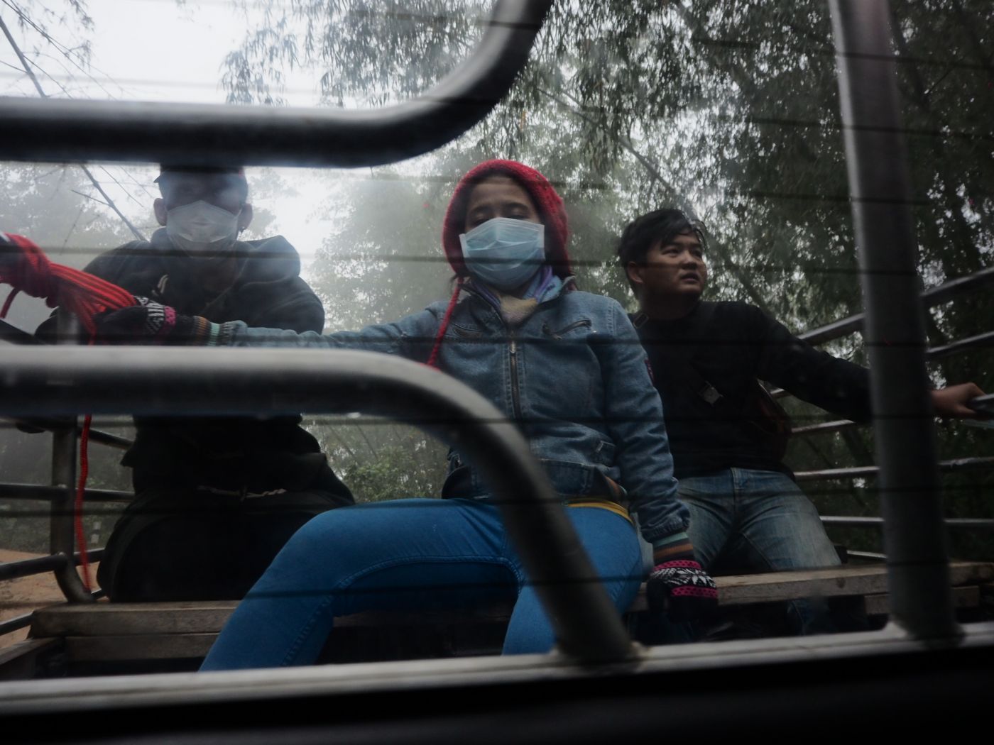 ขากลับ กรุ๊ปเดิมลงจากดอยมาสักสิบโมงได้มั้งทรมานกับความหนาวมาก ตอนขาไปนั่งหลังรถกันหกคนเลยบนนึกสภาพรถขนแรงงานพม่า ขากลับนั่งหลังสาม พี่มด พี่มิน บอม ก้เป็นสภาพที่เห็น