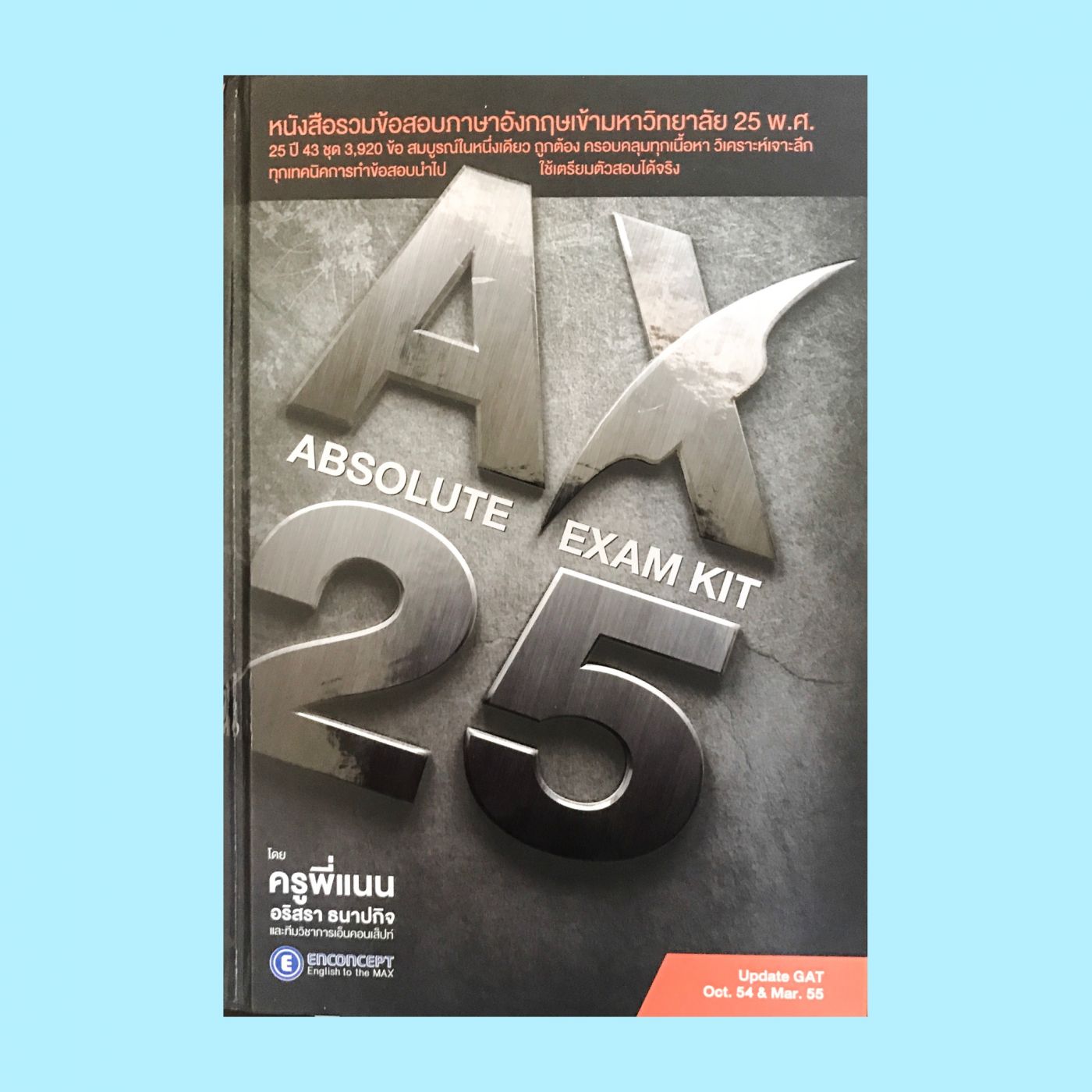 AX-25 by Enconcept - อันนี้เป็นหนังสือรวมข้อสอบที่ค่อนข้างครบมาก (ถึงจะยังไม่อัพเดตจนทันปีปัจจุบัน) แต่ก็ถือว่าข้อสอบเยอะมากอยู่ดี ใครอยากได้แบบฝึกหัดเยอะๆ เล่มนี้คุ้มค่าแน่นอน เฉลยที่พี่แนนก็เขียนละเอียดดีมากๆ มีคำแปล passage ภาษาอังกฤษในเฉลยให้ด้วย