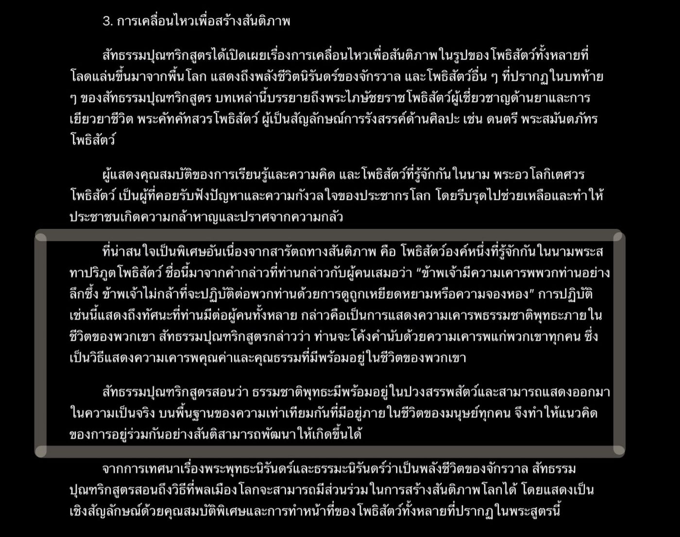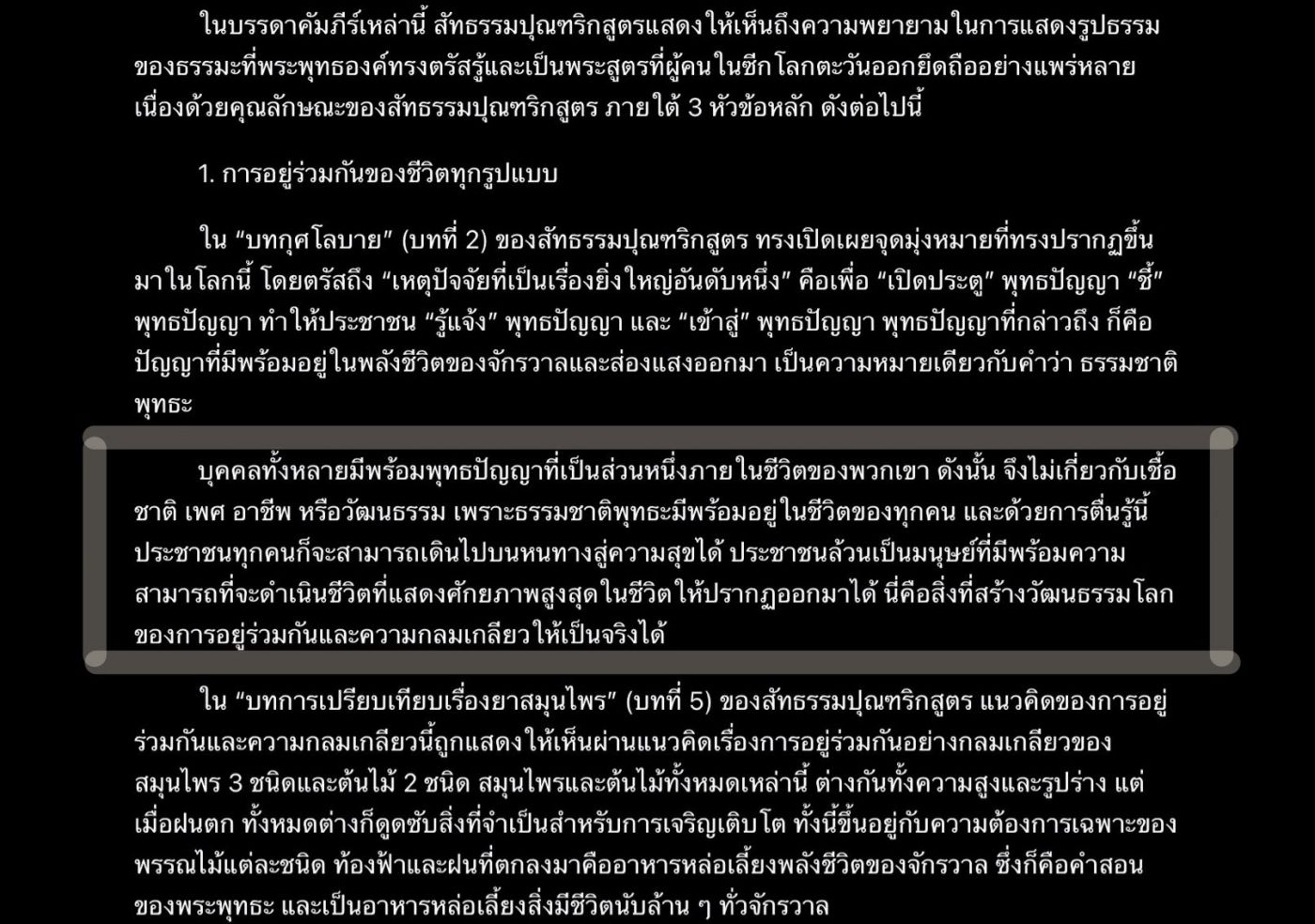 ที่บอกว่าแก่นของพุทธมัน advanced มากแต่ศาสนาพุทธในไทยมันถูกเอามาตีความแบบจำกัดผสม fixed belief และค่อนข้างยึดกับเปลือก ก็คือไม่เกินจริง ไปอ่านเจอสัทธรรมปุณฑรีกสูตร (คำสอนพระพุทธเจ้า) อันนี้มา แล้วแบบ global mindset, 21st century skill มาก ความพลเมืองโลก