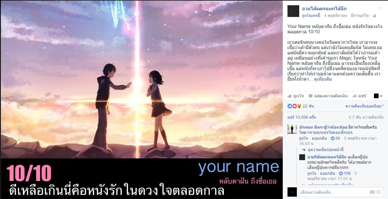 เพราะมันกินใจมากๆไงล่ะ และตรงกับค.รู้สึกของคนเราจริงๆ มีอารมณ์ร่วมค่อนข้างมาก โดยเฉพาะฉากสลับร่างกัน และยังมีค.พีคเข้าไปด้วย ขยี้ความรู้สึกเข้าไปในช่วงไคลแมกซ์อีก ผสมกับงานภาพและเสียงดนตรีที่มาพร้อมกันได้ถูกจังหวะมากๆ ไม่แปลกใจที่ได้คะแนนเยอะขนาดนี้