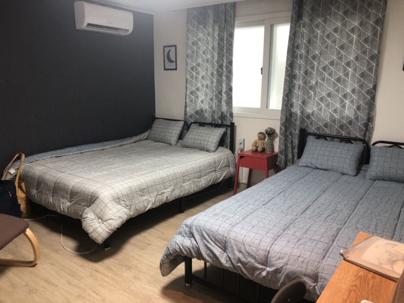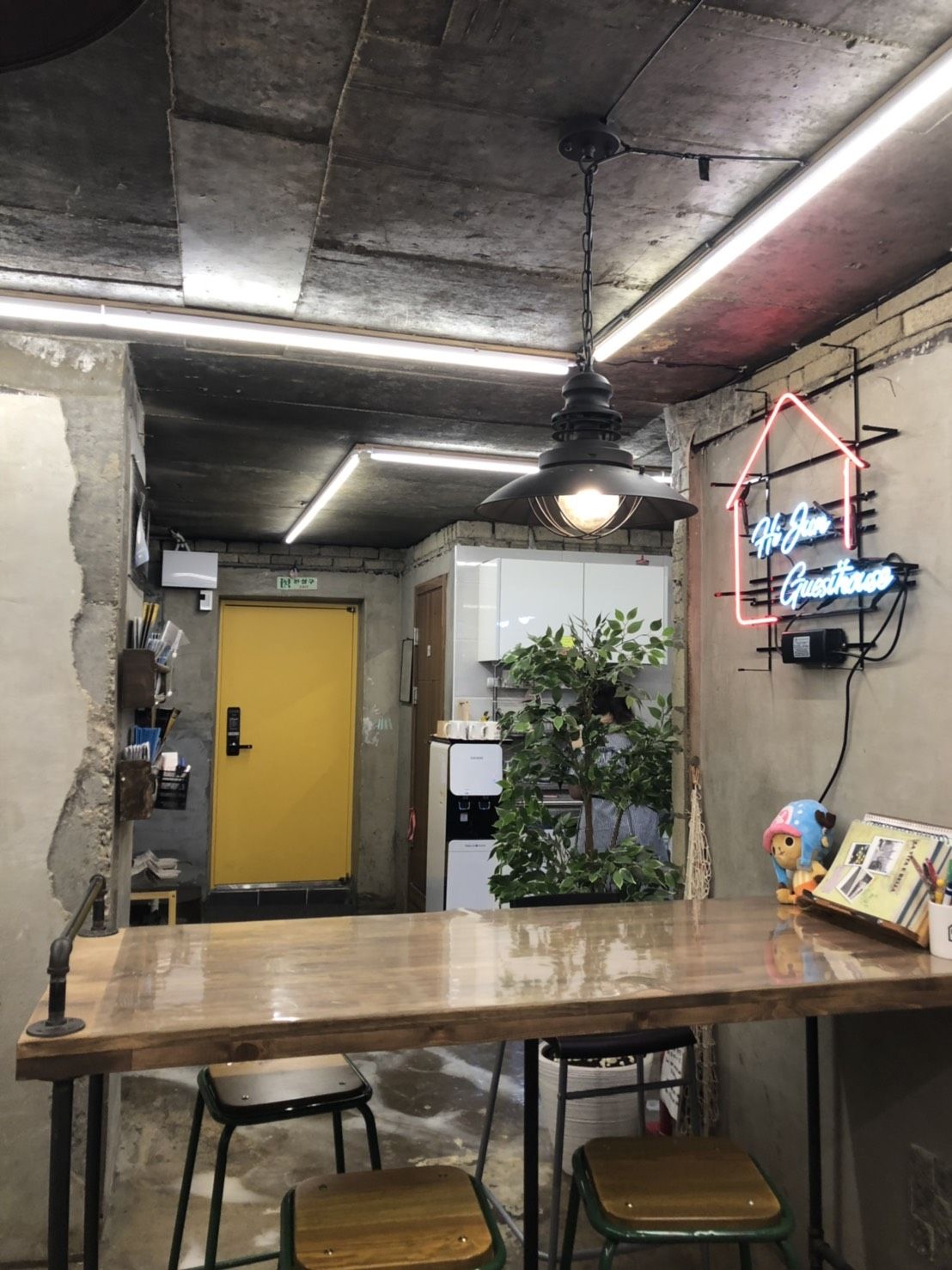 ทานอาหารกลางวันกันเสร็จเรียบร้อยเราจะเดินทางไปยังที่พักกัน ที่พักของเราอยู่ในย่านฮงแดดังนั้นเราจึงนั่งรถไฟใต้ดินจากสถานี Jamsil สายสีเขียวไปยังสถานี Hongik University สายสีเขียว ทางออก 3 จากสถานีไปยังที่พักของเราที่ชื่อว่า Hi Jun Guest House ใช้เวลาประมาณ 10 นาที ที่พักดูดีเลย เราจองที่พักผ่าน Booking.com ห้องสำหรับ 4 คน คืนละประมาณ 2 พันกว่าบาท มีอาหารเช้าให้ด้วย