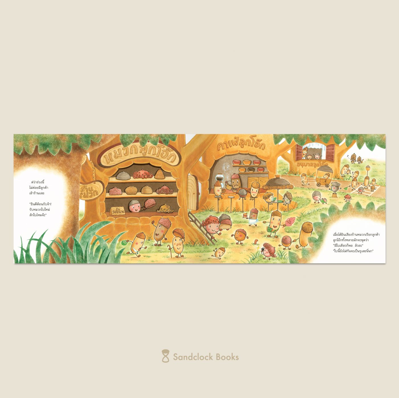 สำนักพิมพ์ SandClock จะซื้อลิขสิทธิ์มาแปล ดังนั้นเมื่อได้รับไฟล์ต้นฉบับหนังสือนิทานจึงต้อง Retouch ข้อความและภาพประกอบบางส่วนจะนำไปใส่คำ เช่น ป้ายร้าน (ในภาพตัวอย่างด้านล่าง)