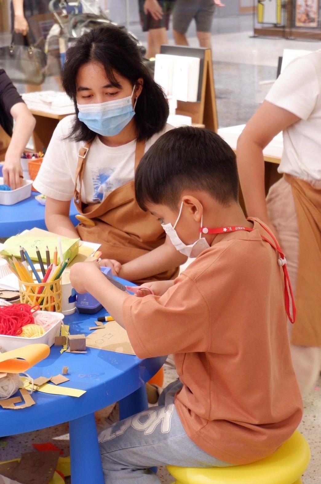 ที่มุม Art&Crafts จะมีกิจกรรมอยู่ด้วยกัน 2 แบบ คือ 'สร้างโรงแรมในป่าใหญ่' กับ 'ออกแบบกระเป๋าที่ร้านของฮาริฮาริ' ซึ่งทุกครั้งที่มีเด็ก ๆ คนใหม่เข้ามาและคุณพ่อคุณแม่ถามว่ามีกิจกรรมอะไรบ้างหรือทำอะไรบ้าง เราก็บอกว่ามีทำกระเป๋ากับโรงแรมจะให้น้องเลือกทำสิ่งที่อยากทำ เด็กบางคนก็ไม่รู้จะเริ่มทำอันไหนก่อนเราก็ค่อย ๆ ถามอ้อม ๆ อยากตกแต่งกระเป๋าไหม หรืออยากสร้างบ้าน มีตัวอย่างให้เขาได้ตัดสินใจ แต่ก็มีเด็กบางคนมีจุดมุ่งหมายชัดเจน